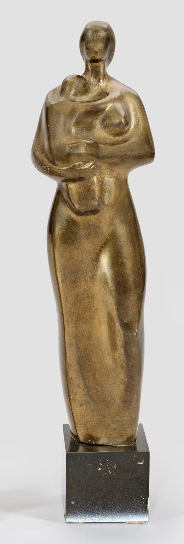 Bronze, poliert und braun patiniert. Monogr. "IB" in Ligatur, dat. (19)88. Kubischer, schwarzer, polierter Steinsockel. Stark stilisierte Statuette mit weich-gerundet verschliffenen Formen in der Tradition der Klassischen Moderne. Blazhev schloss sein Bildhauerei-Studium bei Marko Markov an der Akademie der Künste in Sofia 1950 ab und wurde 1950 oder 1951 Mitglied der Bildhauersektion des Verbandes bulgarischer Künstler. Bekannt wurde er seit den 1950er Jahren vor allem durch zahlreiche, bedeutende, teilw. monumentale Denkmäler, insbesondere des bulgarischen Dichters und Revolutionskämpfers Pejo Jaworow. Ges.-H. 47 cm.