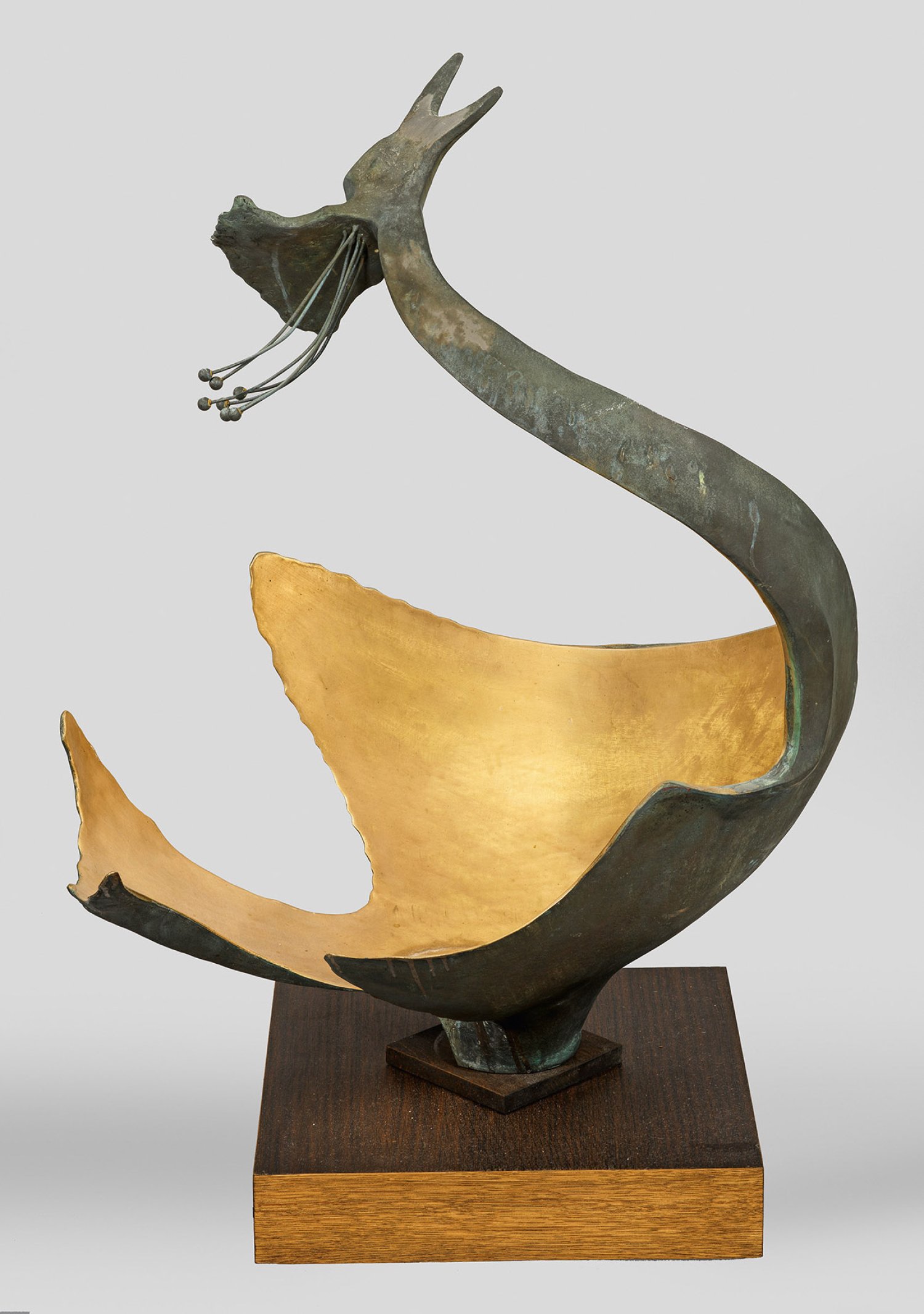 Bronze, außen zusammen mit dem Kopf dunkel patiniert, innen goldfarben poliert. Montiert auf einem quadratischen Eichenholzsockel. Große, stark stilisierte Darstellung eines Reihers, dessen Körper er zu einer offenen, kugelig gemuldeten Schale abstrahierte. Das Werk Nonnenmachers, der seit 1951 in Worms lebte, umfasst hauptsächlich Bronzeskulpturen im sakralen Raum, Brunnenskulpturen im öffentlichen Raum sowie Plastiken in unterschiedlichen Materialien, mit denen er seit den 1970er Jahren in Gestalt von Antikriegs-Mahnmalen auch gesellschaftspolitisch Stellung bezog. Im Stil mit dem "Reiher" vergleichbar, ist seine bereits 1968 entstandene Gruppe "Finish" am Institut für Sportwissenschaft der Johannes Gutenberg-Universität Mainz, bei der er ebenfalls die Körper auflöste. Bronze-H. 92 cm. Ges.-H. 102 cm.