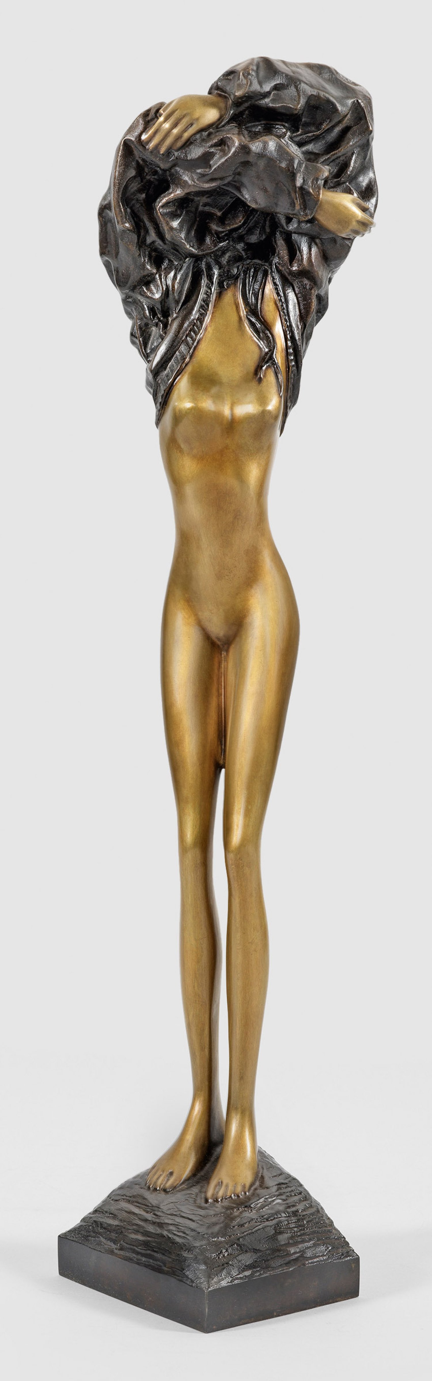 Bronze, goldbraun und schwarz patiniert, 1989. Sign. u. nummeriert 1/20; Gießerstempel. Große Bronze-Statuette eines auf einem gewölbten Sockel stehenden, schlanken weiblichen Aktes, ihr Kleid über dem Kopf ausziehend. Ein Haupsujet im Oeuvre Brunis sind weibliche Aktfiguren in überlängten Proportionen, die Sinnlichkeit und Natürlichkeit der Erotik sowie die Eleganz und Schönheit des menschlichen Körpers ausdrücken wollen. Bruni besuchte 1953 - 1959 das Instituto d’Arte in Pesaro. Nach Ausstellungen in Italien und London, ging er 1960 nach Hamburg an die Staatliche Hochschule für Bildende Künste, wo er bei Georg Gresko studierte. Nach Greskos Tod (1962) studierte er bei Paul Wunderlich, 1965 verließ er die Hochschule, lebt und arbeitet seitdem als freischaffender Künstler in Hamburg, Hannover und Pesaro. H. 91,5 cm.