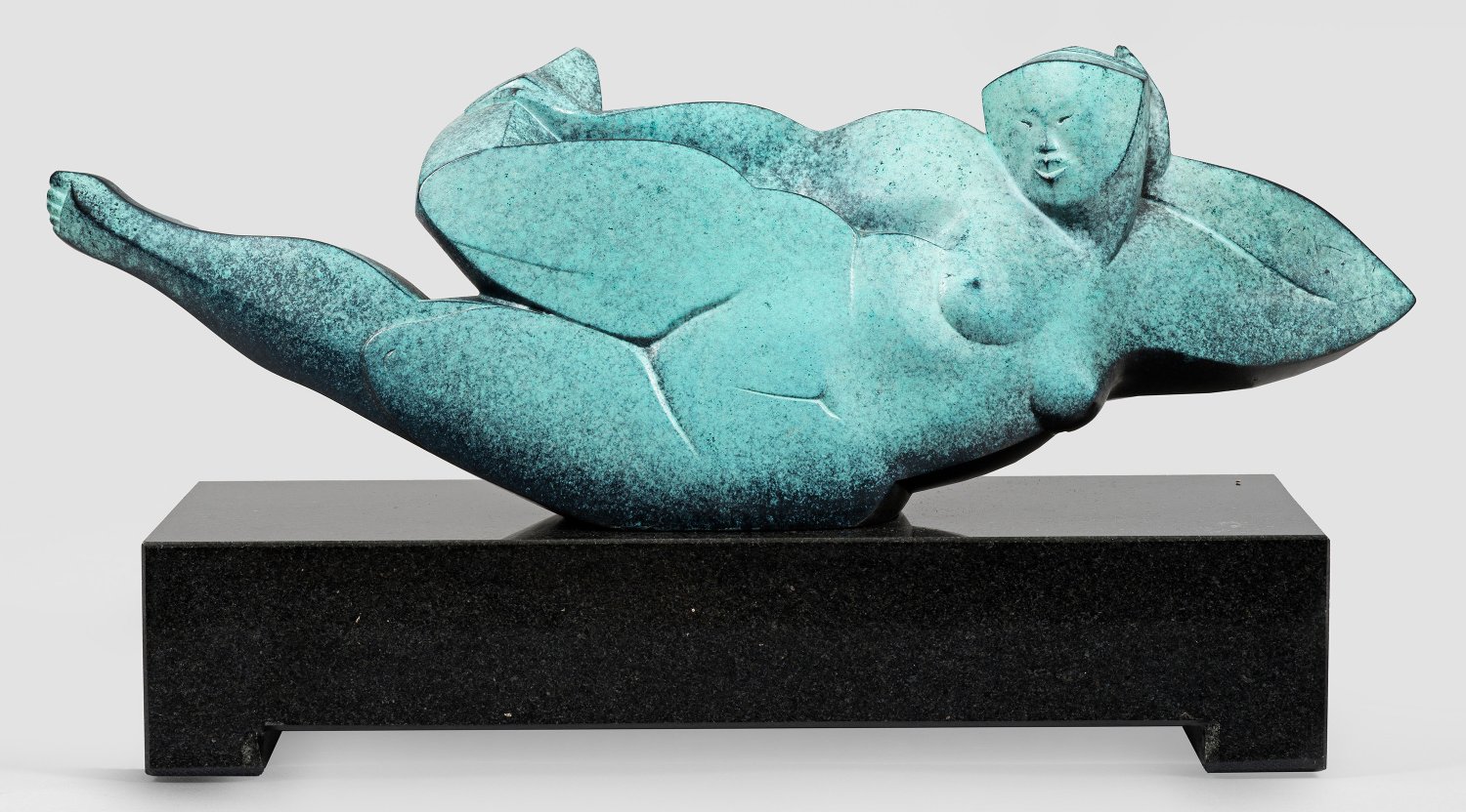 Light green and dark patinated bronze on black granite base, 1994. Signed with monogram and dated.