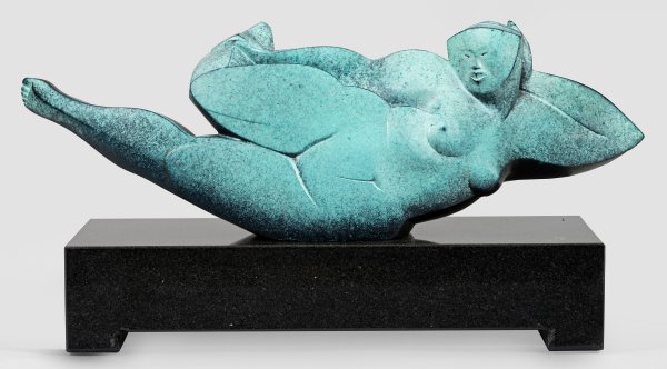 Bronze, in hellgrünen und dunklen Tönen patiniert, 1994. Sign. mit Monogramm u. dat.; Schwarzer Granitsockel. Der niederländisch-deutsche Bildhauer und Designer studierte Bildhauerei an der Kunstakademie in Utrecht und arbeitet seit 1972 als freier Künstler. In Auseinandersetzung mit der Kunst der Moderne nimmt er bei seinen Arbeiten Einflüsse des Kubismus und des Art Déco auf. Diese setzt er aus verschiedenen Einzelformen in dynamisch gespannte, partiell scharfkantige Figuren um, mit Vorliebe menschliche Figuren und Pferde. 1991 wurde Lenssinck, der in vielen Ausstellung vertreten war, für sein künstlerisches Werk mit dem Pieter d’Hont-Preis ausgezeichnet. Arbeiten Willem Lenssincks befinden sich unter anderem in den Sammlungen des British Museum (London). Bronze ca. 16 cm x 49 cm x 20 cm; Ges.-H. 24 cm.