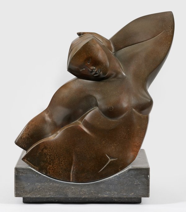 Bronze, dunkelbraun patiniert, eingepasst in einen dunkelgrauer Marmorsockel, 2006. Sign. mit Monogramm u. dat.; Auflage 24 Exemplare. Der niederländisch-deutsche Bildhauer und Designer studierte Bildhauerei an der Kunstakademie in Utrecht und arbeitet seit 1972 als freier Künstler. In Auseinandersetzung mit der Kunst der Moderne nimmt er bei seinen Arbeiten Einflüsse des Kubismus und des Art Déco auf. Diese setzt er aus verschiedenen Einzelformen in dynamisch gespannte, partiell scharfkantige Figuren um, mit Vorliebe menschliche Figuren und Pferde. 1991 wurde Lenssinck, der in vielen Ausstellung vertreten war, für sein künstlerisches Werk mit dem Pieter d’Hont-Preis ausgezeichnet. Arbeiten Willem Lenssincks befinden sich unter anderem in den Sammlungen des British Museum (London). Ges.-Maße ca. 49,5 cm x 45 cm x 25 cm.