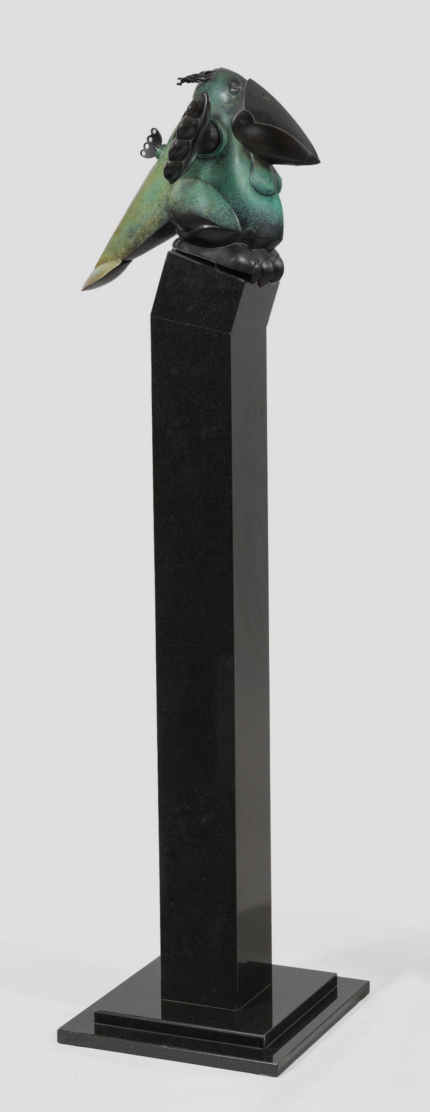 Bronze, braun und grün patiniert, mit beweglichen Teilen auf rechteckigem, gestuftem Granitsockel stehend. Mit seinen aufgerichteten fingerartigen Flügeln, breitem Schnabel, der eher einem Visier gleicht, angedeuteter Brust und einem drahtigen Haarkamm, steht dem Betrachter fast in Augenhöhe ein liebreizender Vogel gegenüber. Willem J. Lenssinck studierte an der Kunstakademie von Utrecht Bildhauerei und nach seinem Abschluss arbeitete er als Designer für industrielle Baukeramiken, entwirft Plastiken u.a. in Bronze, Möbel und Lichtobjekte. Seine Plastiken zeichnen sich durch glatte, hochglanzpolierte Oberflächen und eine strenge Linienführung aus. Unterhalb des Schwanzflügels monogr. und dat." WL 2011". Ges.-H. 144 cm.