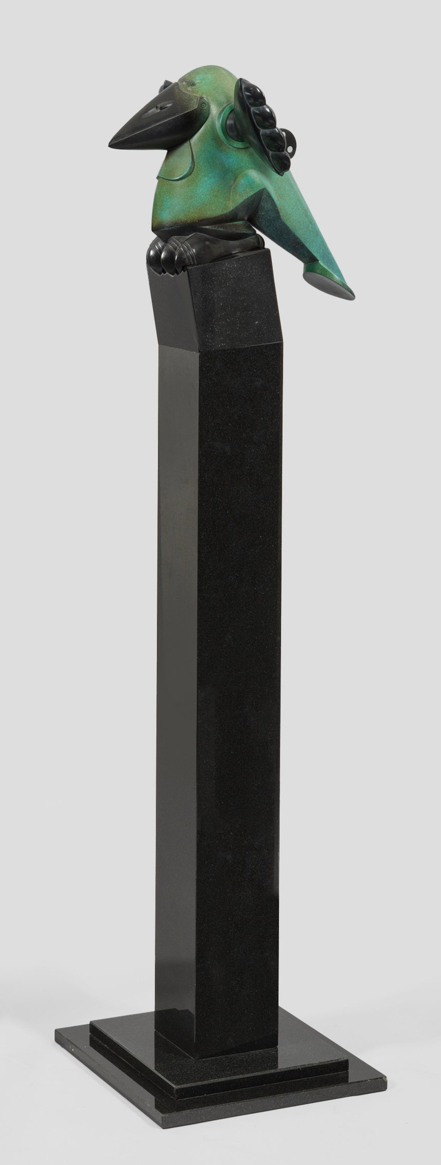 Bronze, braun und grün patiniert, mit beweglichen Teilen auf rechteckigem, gestuftem Granitsockel stehend. Mit seinen aufgerichteten fingerartigen Flügeln, breitem Schnabel, der eher einem Visier gleicht, und einem drahtigen Haarkamm steht dem Betrachter fast in Augenhöhe ein liebreizender Vogel gegenüber. Willem J. Lenssinck studierte an der Kunstakademie von Utrecht Bildhauerei und nach seinem Abschluss arbeitete er als Designer für industrielle Baukeramiken, entwarf Plastiken u.a. in Bronze, Möbel und Lichtobjekte. Seine Plastiken zeichnen sich durch glatte, hochglanzpolierte Oberflächen und eine strenge Linienführung aus. Unterhalb des Schwanzflügels monogr. und dat. "WL 2013". Ges.-H. 144 cm.