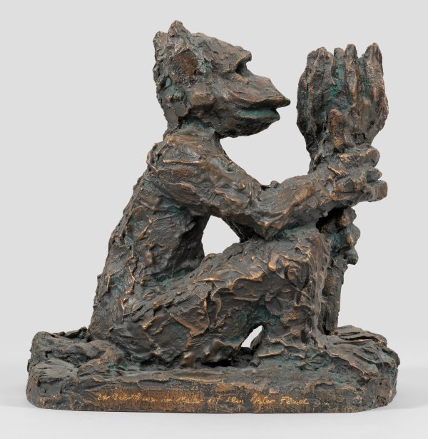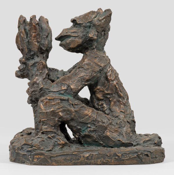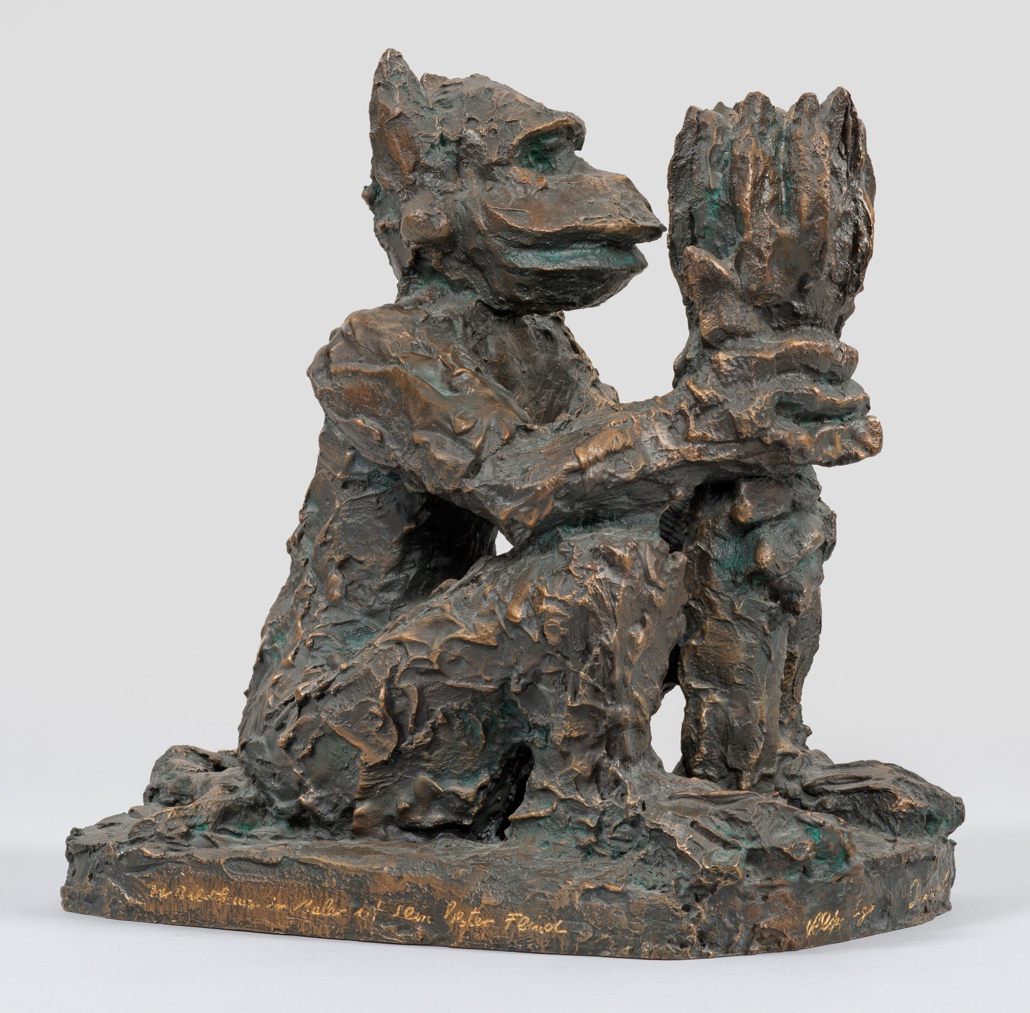 Bronze, braun patiniert, partiell poliert, 1995. Sign., dat., nummeriert 330/980; Gießerstempel, Guss ARA Kunst, Dr. Fritz Albrecht, Altrandsberg. Exemplar aus einer Sonder-Edition in einer 10er-Auflage mit brauner Patinierung (innerhalb der 980er Nummerierung) als ungeteilte Bronze-Plastik, Guss 2007. An der Plinthe Inschrift "Der Bildhauer im Maler ist sein bester Feind". Vollplastische, expressive Darstellung eines sitzenden Affen, einen überdimensionalen Pinsel haltend und betrachtend, die Oberfläche in lebendig reliefierter Textur durch die roh belassenen Tonklumpen des Modells. Für Immendorff, der die deutsche Kunst seit den 1970er Jahren prägte, war der Affe das Sinn- oder Ebenbild des Malers, quasi sein "Alter Ego". Der "Maleraffe" wurde daher ein immer wiederkehrendes Motiv im gesamten Oeuvre Immendorffs. In einer großen Plastik von 2002 hat er sich sogar selbst als Maleraffen an der Hand von Joseph Beuys dargestellt, bei dem er in den 1960er Jahren an der Düsseldorfer Akademie studierte. 1989 erhielt er eine Professur an der Städelschule in Frankfurt am Main, ab 1996 war er Professor an der Kunstakademie Düsseldorf. Ca. 38 cm x 38 cm x 26 cm.