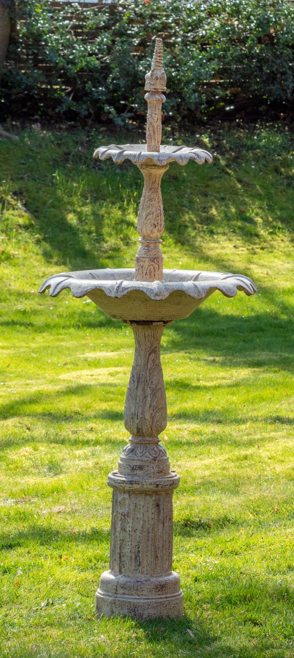 Gusseisen, cremefarben lackiert. Über profilierter Basis mehrfach gegliederter, sich konisch verjüngender, blattreliefierter Balusterschaft als Träger für zwei gestaffelt angeordnete Brunnenschalen unterschiedlicher Größe. H. 170 cm.