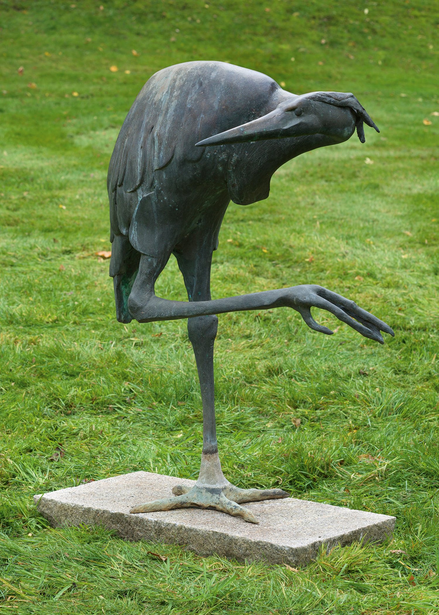 Bronze, dunkel patiniert. In moderner Weise stilisierte und zugleich lebendige, vollplastische Darstellung eines schreitenden Reihers auf rechteckigem Steinsockel. H. ca. 101 cm.