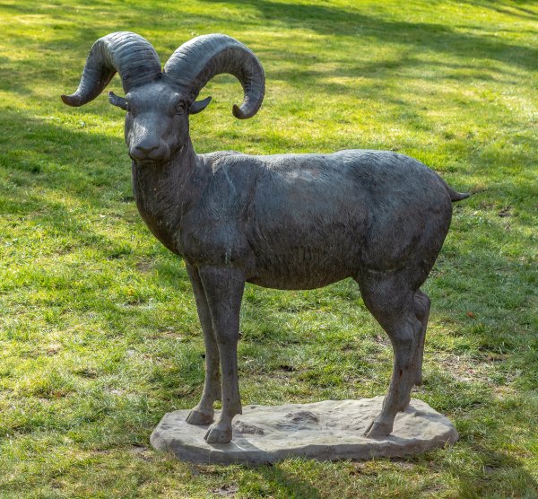 Bronze, dunkel patiniert. Rechteckig abgerundete Plinthe. Naturnah beobachtete, lebendig geschilderte, annähernd lebensgroße, vollplastische Darstellung eines aufmerksam blickenden Bockes des Europäischen Mufflons mit schneckenartig eindrehten Hörnern und feiner Fellzeichnung. H. ca. 115 cm.