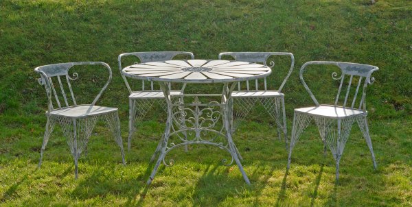 5-tlg.; Tisch und vier Stühle. Metall, teilw. grau-grün lackiert. Gestell aus gebogten Streben und gegeneinander gestellten Volutenmotiven als Träger für runde Deckplatte. Korrespondierende Stühle mit gebogter Lehnenrahmung. Tisch-H. 78 cm. D. 104 cm. Sitz-H. 46 cm.