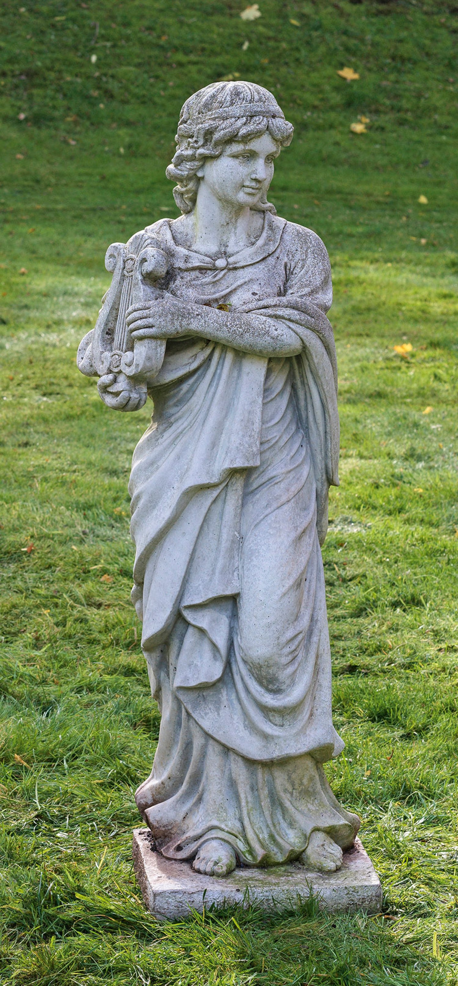 Steinguss. Vollplastisch gestaltete Figur einer antikisierend gewandeten, jungen Frau mit Leier auf rechteckigem Sockel. Ges.-H. ca. 115 cm.