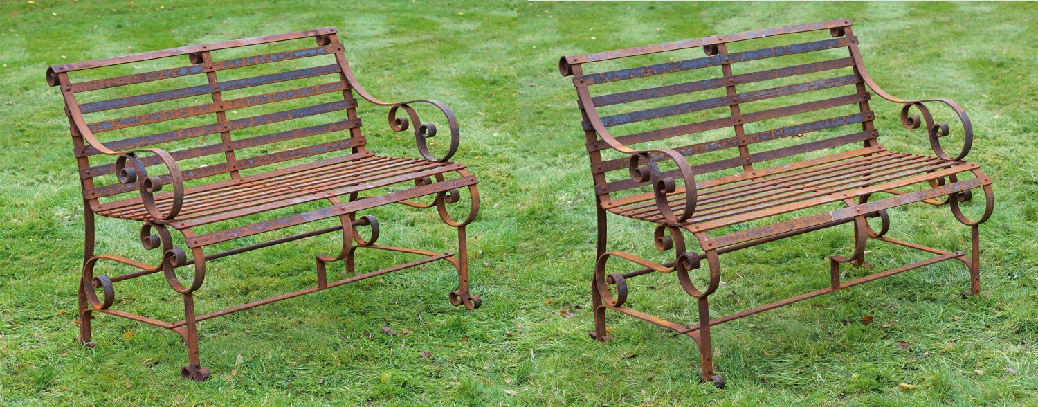 Eisen mit Rostpatina. Schmale, durchbrochen gearbeitete Seitenwangen aus eingerollten Voluten. Geschweifte Sitz- und Lehnenfläche aus schmalen Stegen. H. 89 cm. 109 cm x 73 cm. Sitz-H. 45 cm.