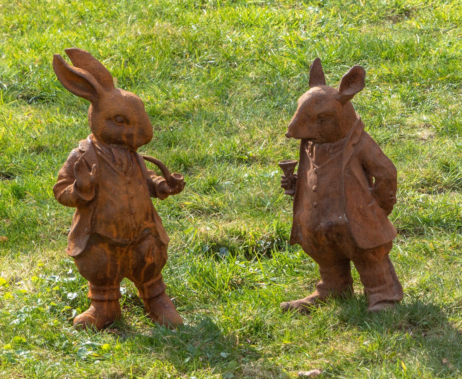 Two cast iron garden figures of Peter Rabbit and Mr. Ratty after Beatrix Potter. Rust patina.