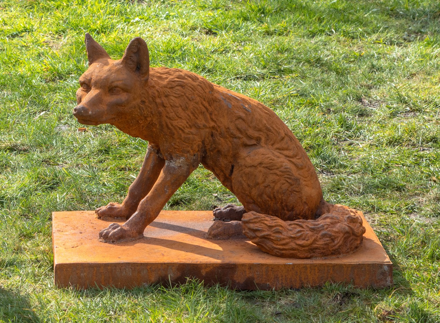 Gusseisen, mit Rostpatina. Lebensgroße vollplastische Darstellung eines Fuchses auf rechteckiger Plinthe. H. 50 cm. 67 cm x 40 cm.
