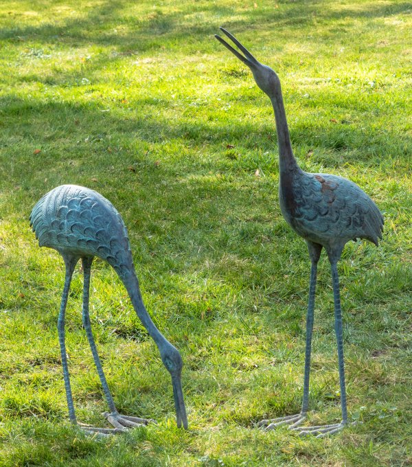 Bronze, graugrün patiniert. Vollplastische Darstellungen der Kraniche mit gesenktem bzw. hoch erhobenem Kopf. H. 54 cm - 90 cm.