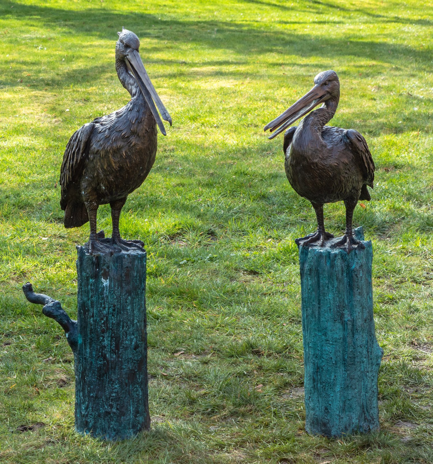 Bronze, braun und grün patiniert. Vollplastische, realistische Darstellung jeweils eines auf einem Baumpfosten sitzenden Pelikans. H. 95 cm - 106 cm.