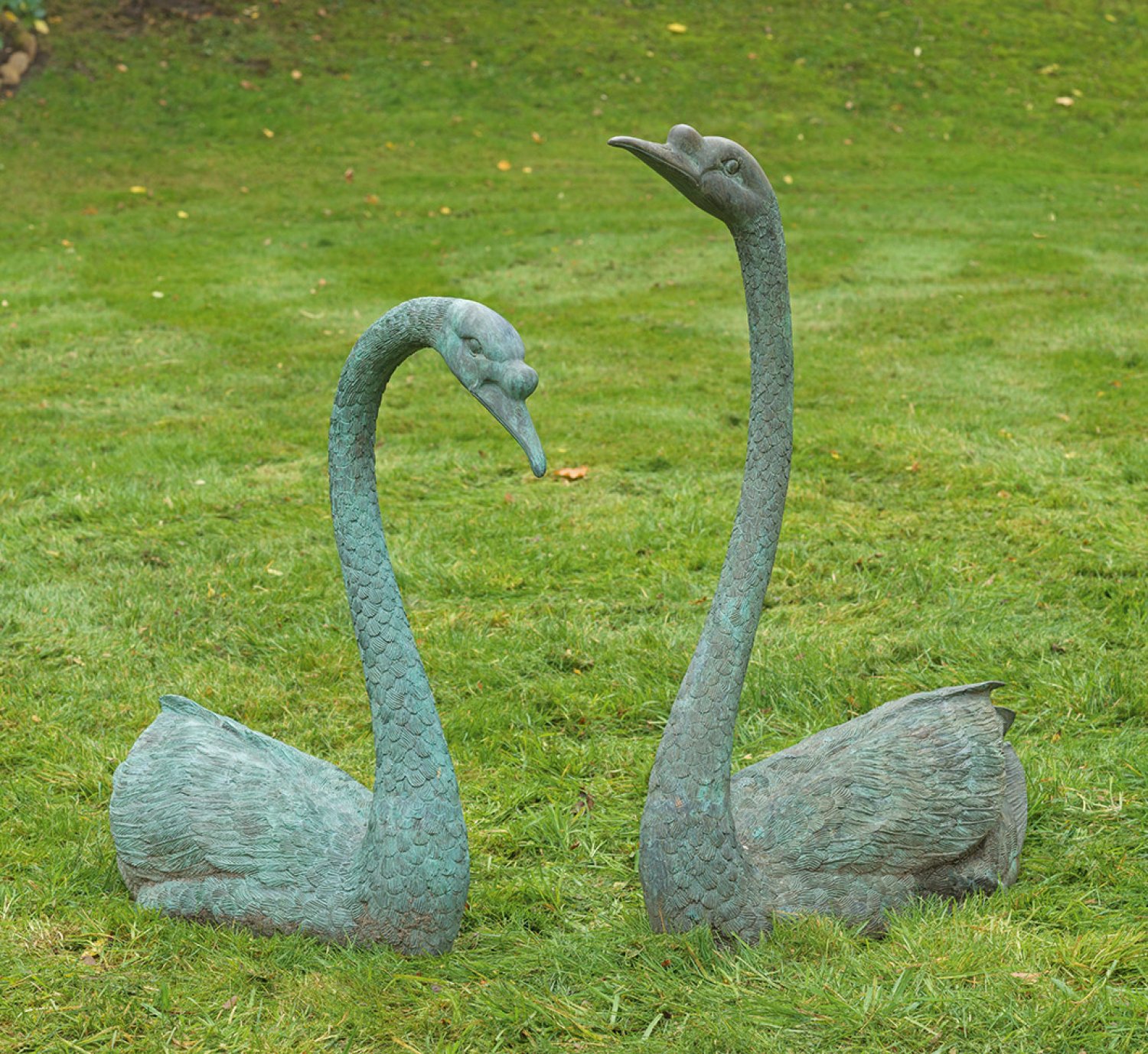 Gegenstücke. Bronze, grün patiniert. Vollplastische, annähernd lebensgroße, naturgetreue, lebendige Darstellungen zweier schwimmender Schwäne mit gesenktem bzw. hoch erhobenem Kopf. Detailreich modellierte Federzeichnung. H. ca. 72-91 cm.
