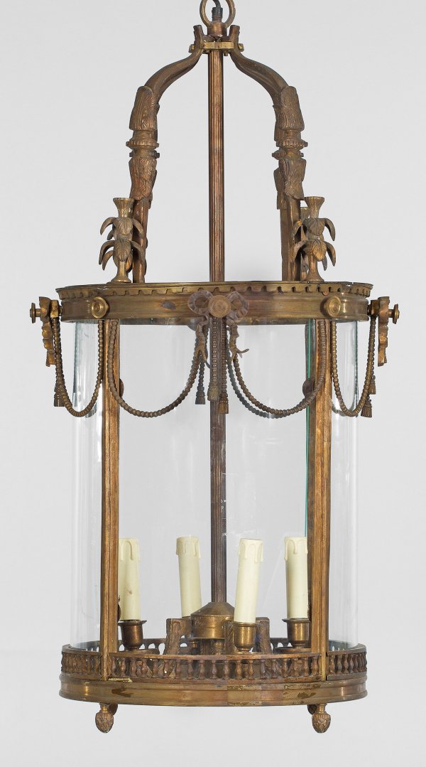 4-flg.; Bronze, patiniert und farbloses Glas. Zylinderförmiger Korpus aus schmalen Streben, umgeben von schleifenbekrönten Festons aus Perlstab. Oberer Abschluss aus stark geschwungenen Volutenmotiven. In der Mitte schlanker, godronierter Schaft als Träger für Leuchtmittel. Elektrifiziert. H. 90 cm. D. 38 cm.