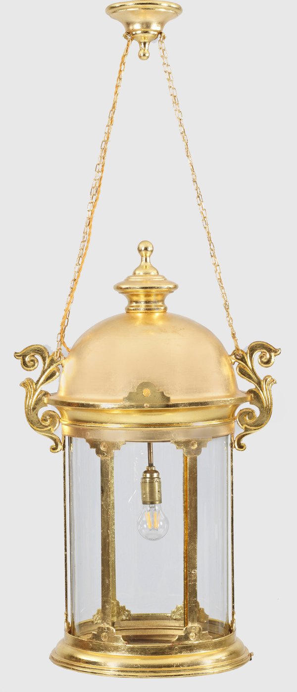 1-flg.; Metall, flächendeckend neu vergoldet. Über profilierter, offen gestalteter Basis zylinderförmiger Korpus als Träger für Leuchtmittel. Kuppelförmiger oberer Abschluss mit Balusterbekrönung, flankiert von großen Volutenmotiven für Kettenaufhängung. Elektrifiziert. Rest.; H. 81 cm. D. 48 cm.
