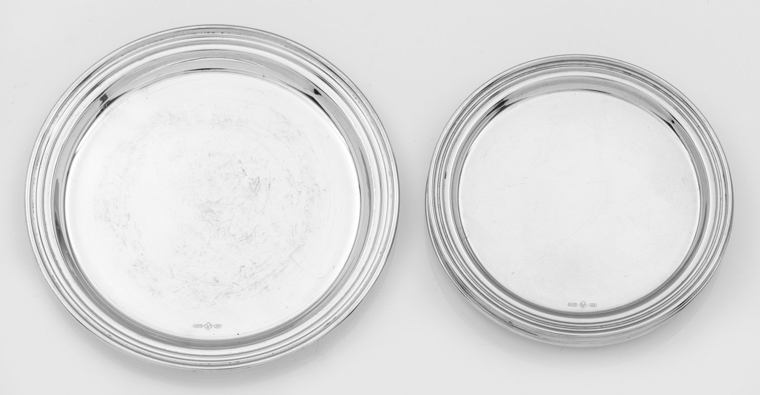 Sieben Untersetzer Silber. Glatte, gemuldete Form mit profiliertem Rand. Für sechs Gläser und eine Flasche. Gest. 800. Herstellerzeichen. Gew. ca. 285 g. D. 9,5 bzw. 11,7 cm. A set of seven Italian coasters. Standard mark 800. Italien. Padua. 20. Jh.