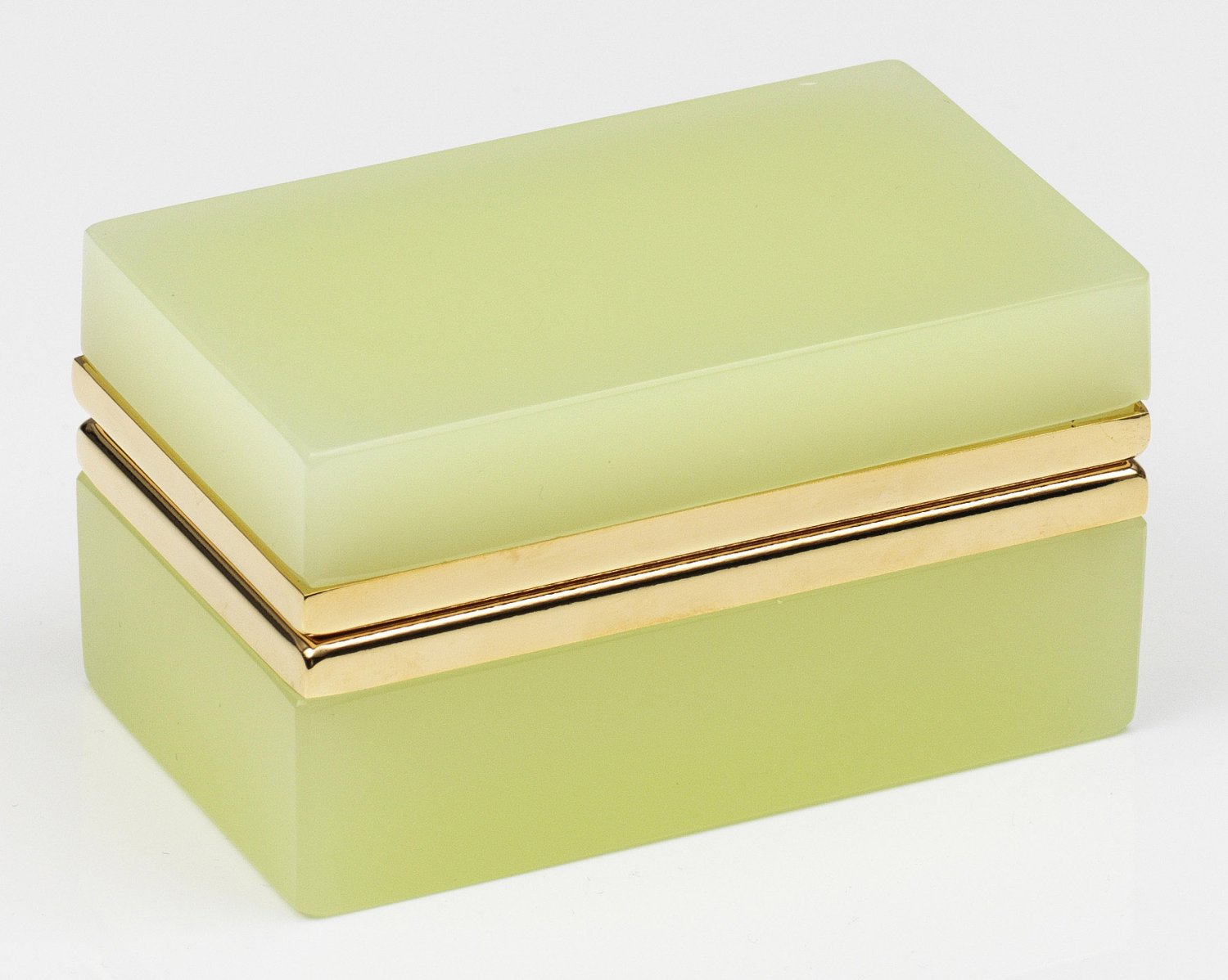 Art Déco-Dose Rechteckig. Gelbgrünes bzw. limettengrünes, geschliffenes und poliertes Opalglas. Scharnierte Messingmontierung. H. 6 cm. 11 cm x 6,5 cm. A French Art Deco cut and polished yellowish-green or lime green glass box and brass-mounted hinged cover. Frankreich. Um 1935-1940.