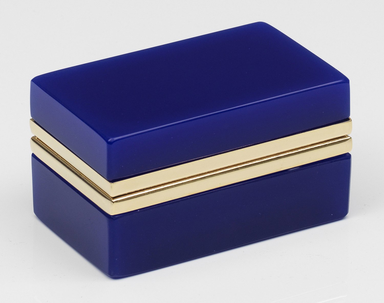 Art Déco-Dose Rechteckig. Dunkelblaues, geschliffenes und poliertes Opalglas. Scharnierte Messingmontierung. H. 6 cm. 11 cm x 6,5 cm. A French Art Deco cut and polished dark blue glass box and brass-mounted hinged cover. Frankreich. Um 1935-1940.