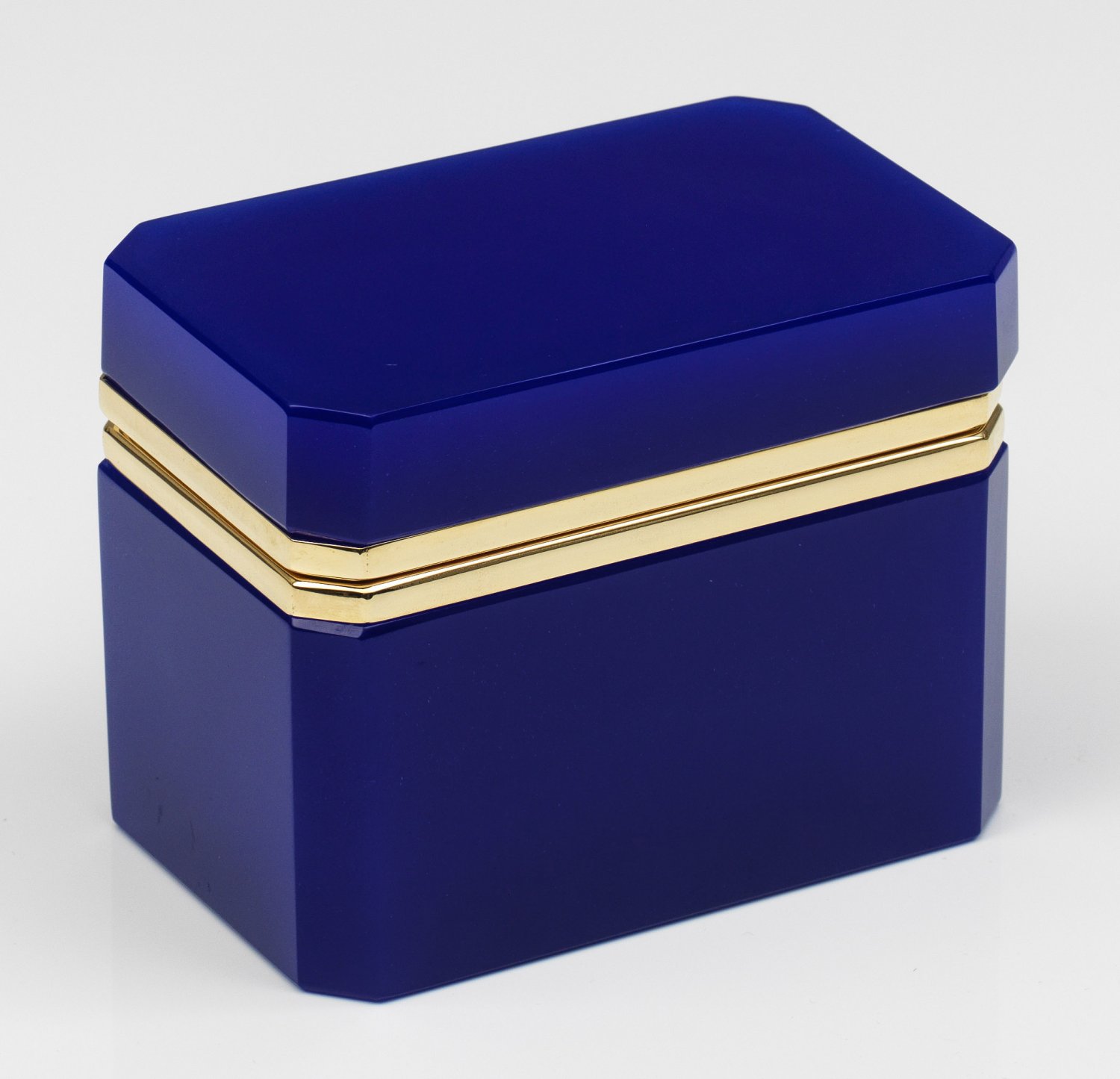Art Déco-Schatulle Quaderform mit abgeschrägten Ecken. Dunkelblaues Opalglas, geschliffen und poliert. Scharnierte Messingmontierung. Altersbedingte Gebrauchsspuren. H. 10,2 cm. 13,3 cm x 8,5 cm.