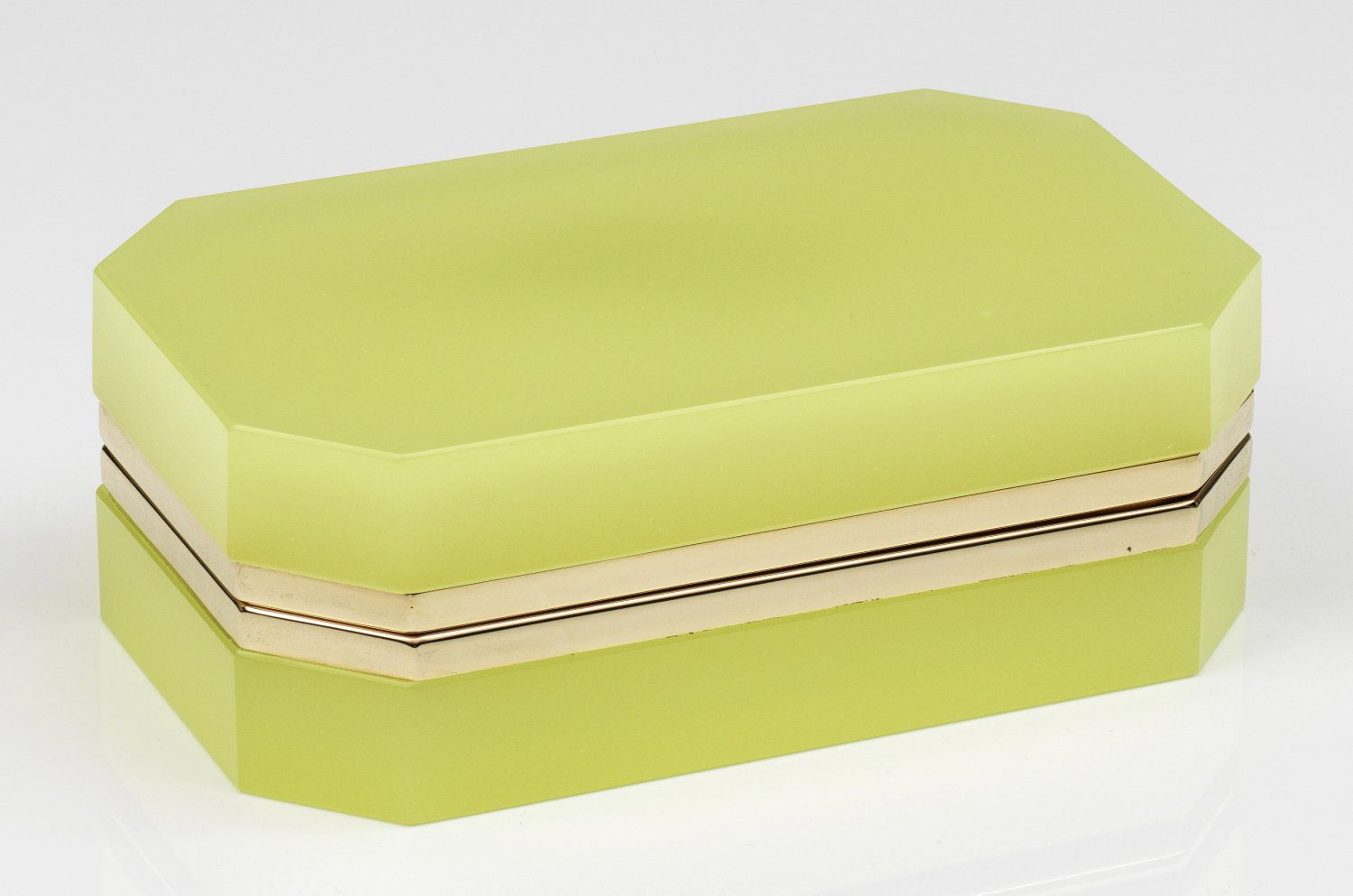 Große Art Déco-Schatulle Rechteckige Form mit abgeschrägten Ecken. Gelbgrünes bzw. limettengrünes Opalglas, geschliffen und poliert. Scharnierte Messingmontierung. H. 8 cm. 22,5 cm x 13,5 cm.