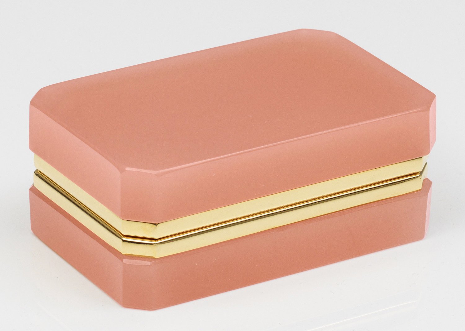Art Déco-Dose Rechteckige Form mit abgeschrägten Ecken. Rosafarbenes Opalglas, geschliffen und poliert. Scharnierte Messingmontierung. H. 5,5 cm. 13,3 cm x 8,5 cm. A French Art Deco cut and polished pink-coloured glass box and brass-mounted hinged cover. Frankreich. Um 1935-1940.
