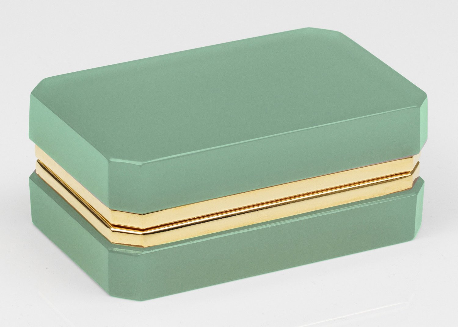 Art Déco-Dose Rechteckige Form mit abgeschrägten Ecken. Mintgrünes Opalglas, geschliffen und poliert. Scharnierte Messingmontierung. H. 5,5 cm. 13,3 cm x 8,5 cm. A French Art Deco cut and polished mint green glass box and brass-mounted hinged cover. Frankreich. Um 1935-1940.