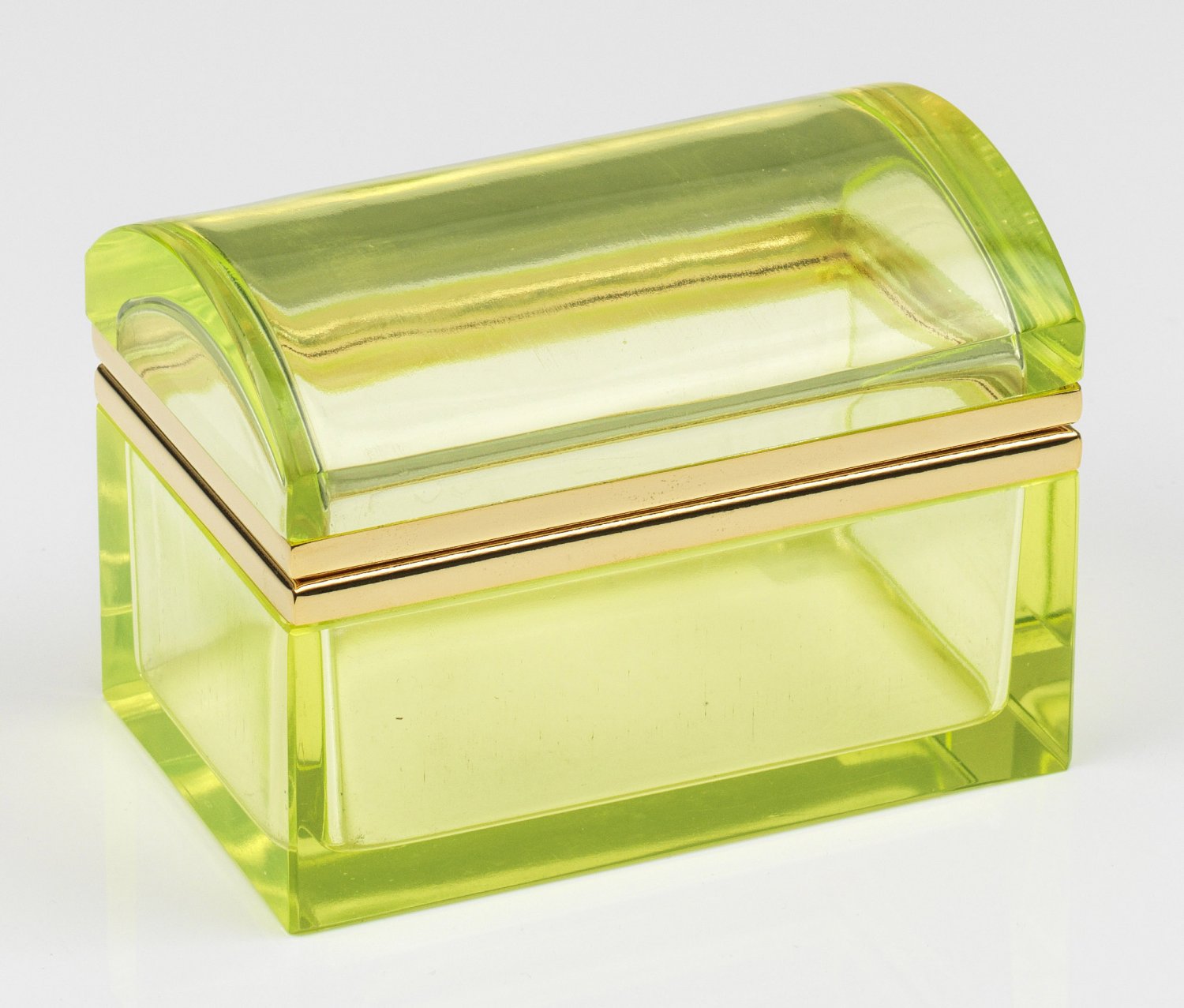 Art Déco-Dose Truhenform mit Runddeckel. Transparentes gelbgrünes Uranglas, geschliffen und poliert. Scharnierte Messingmontierung. H. 9,5 cm. 13,3 cm x 8,5 cm. A chest-shaped French Art Deco cut and polished yellowish-green uranium glass box with brass-mounted hinged cover. Frankreich. Um 1935-1940.