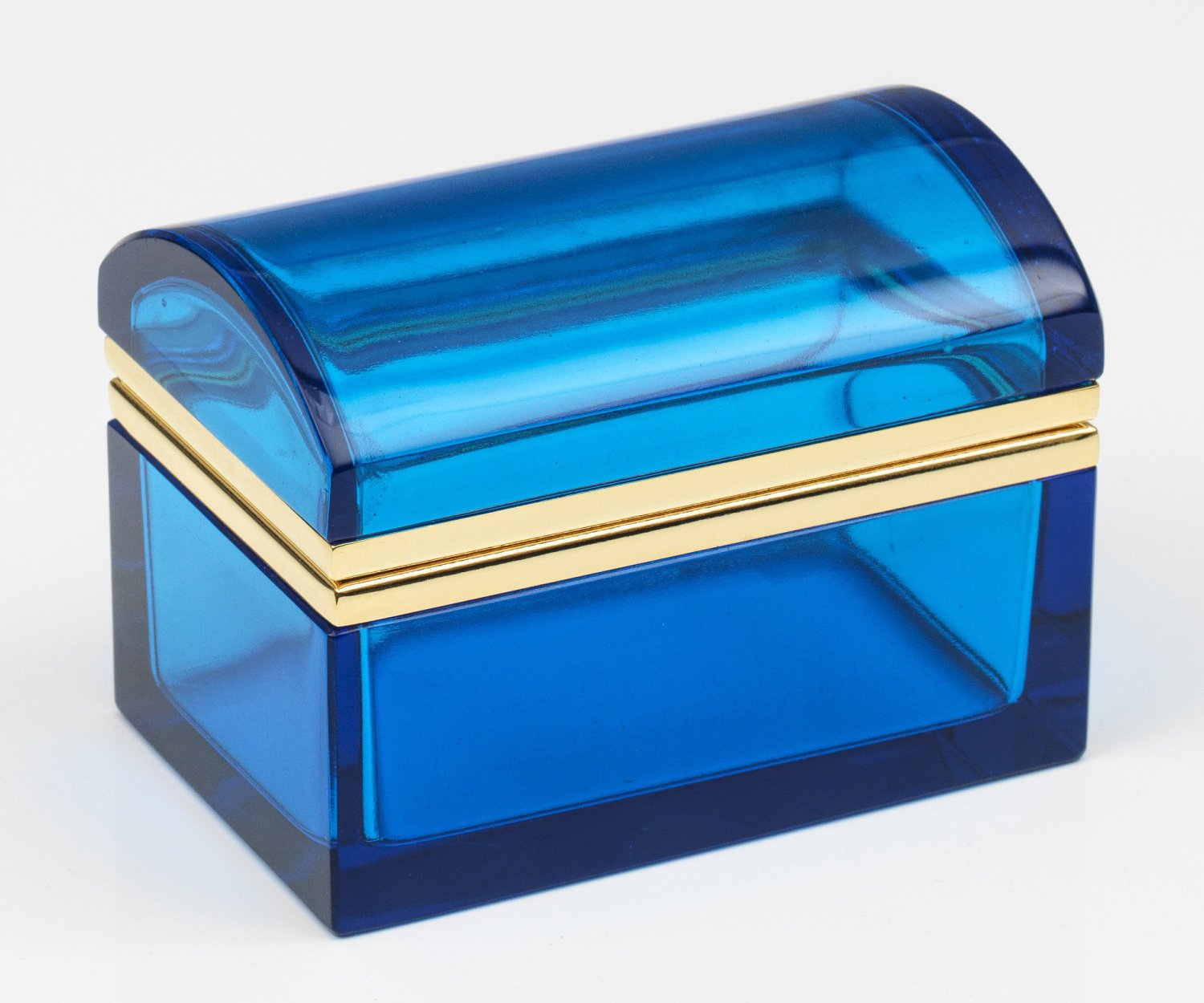 Art Déco-Dose Truhenform mit Runddeckel. Transparentes persischblaues Glas, geschliffen und poliert. Scharnierte Messingmontierung. H. 9,5 cm. 13,3 cm x 8,5 cm. A chest-shaped French Art Deco cut and polished Persian blue glass box with brass-mounted hinged cover. Frankreich. Um 1935-1940.