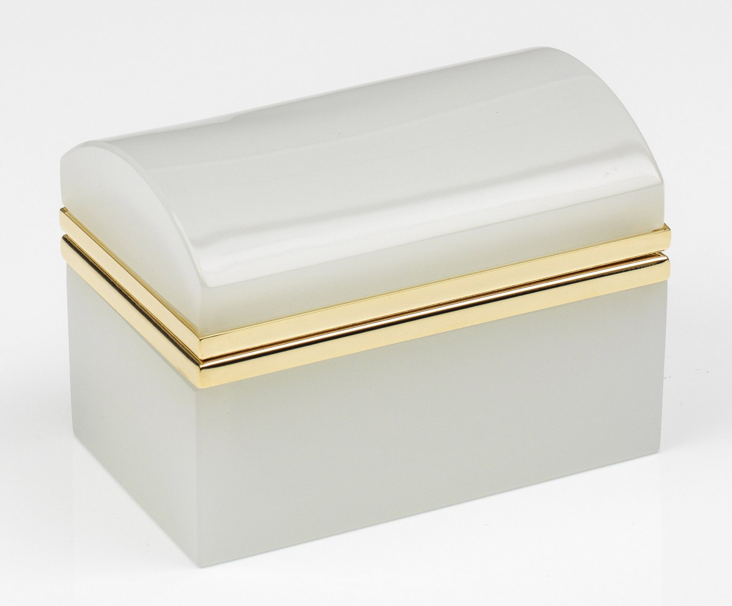 Art Déco-Dose Truhenform mit Runddeckel. Weißes, geschliffenes und poliertes Opalglas. Scharnierte Messingmontierung. H. 9,5 cm. 13,3 cm x 8,5 cm. A chest-shaped French Art Deco cut and polished white glass box and brass-mounted hinged cover. Frankreich. Um 1935-1940.