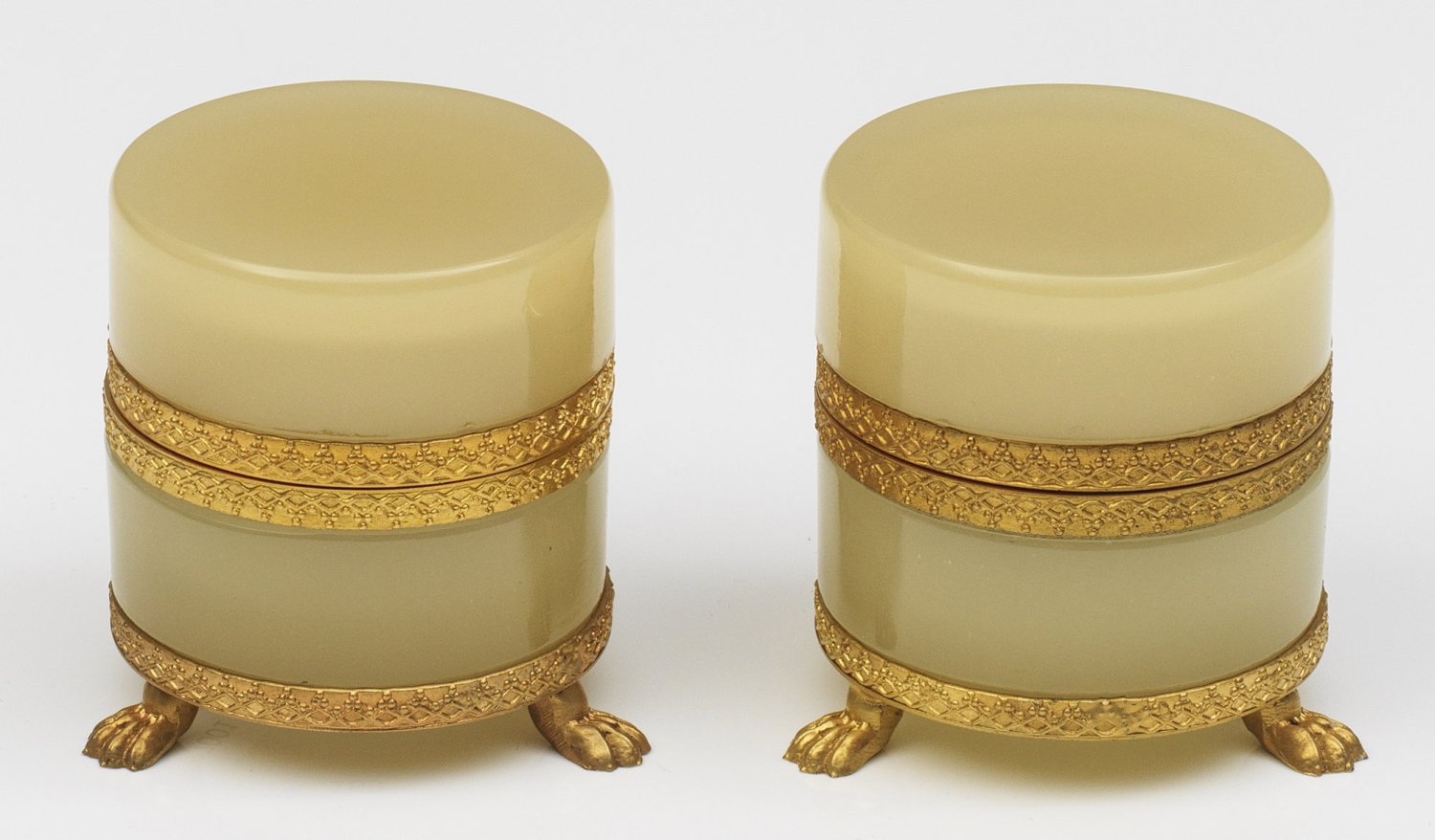 Paar Zierdosen Zylindrisch. Von je drei Tatzenfüßen getragener Korpus. Apricotfarbenes Opalglas, geschliffen und poliert. Scharnierte Messingmontierung mit reliefierter Ornamentbordüre. H. 5,7 cm.