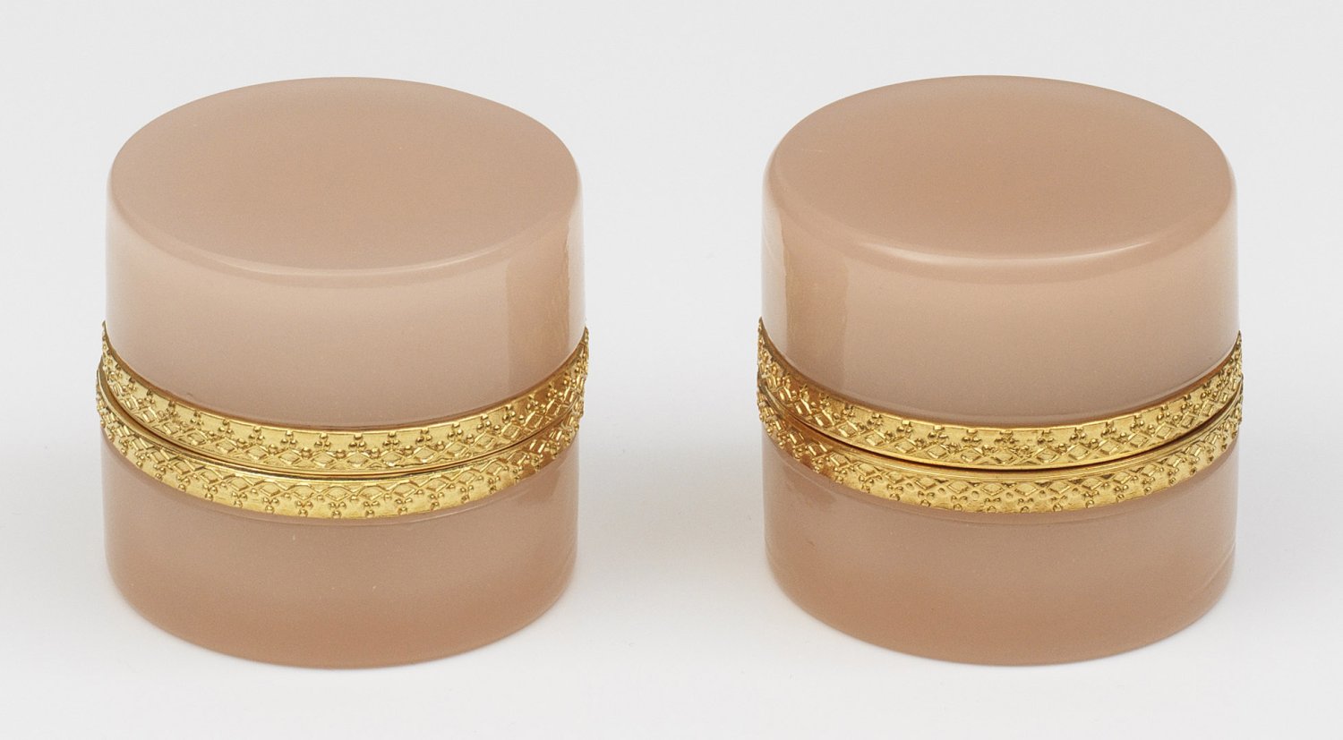 Paar Art Déco-Dosen Zylindrisch. Rosafarbenes Opalglas, geschliffen und poliert. Scharnierte Messingmontierung mit reliefierter Ornamentbordüre. H. 5,5 cm. A pair of French Art Deco cut pink-coloured glass boxes with brass-mounted hinged cover. Frankreich. Um 1935-1940.