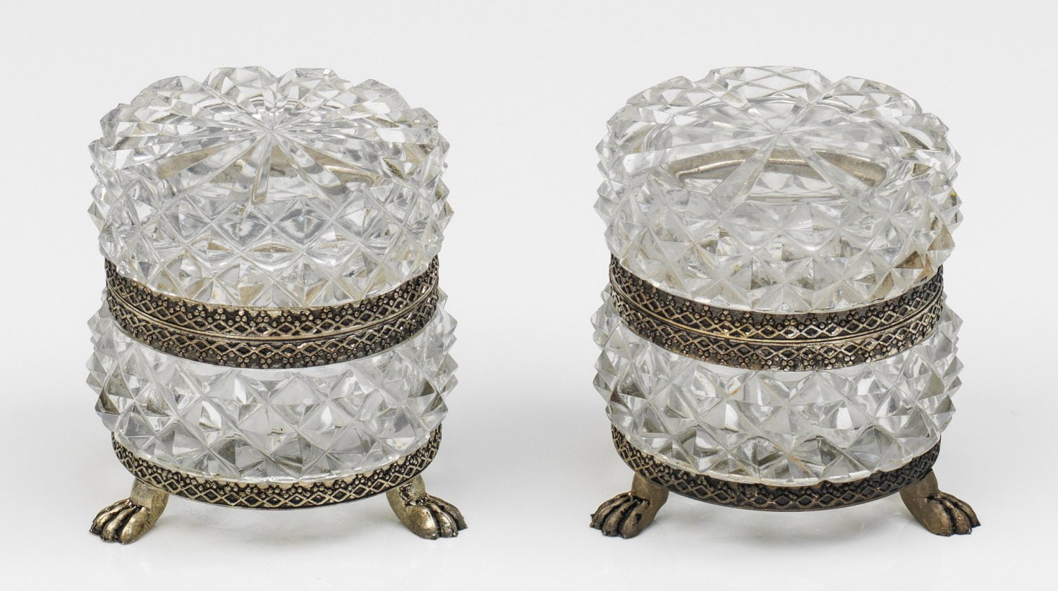 Paar Zierdosen Zylindrisch. Von je drei Tatzenfüßen getragener Korpus. Farbloses Kristallglas mit Steineldekor, geschliffen und poliert. Scharnierte Metallmontierung mit reliefierter Ornamentbordüre. H. 7 cm.
