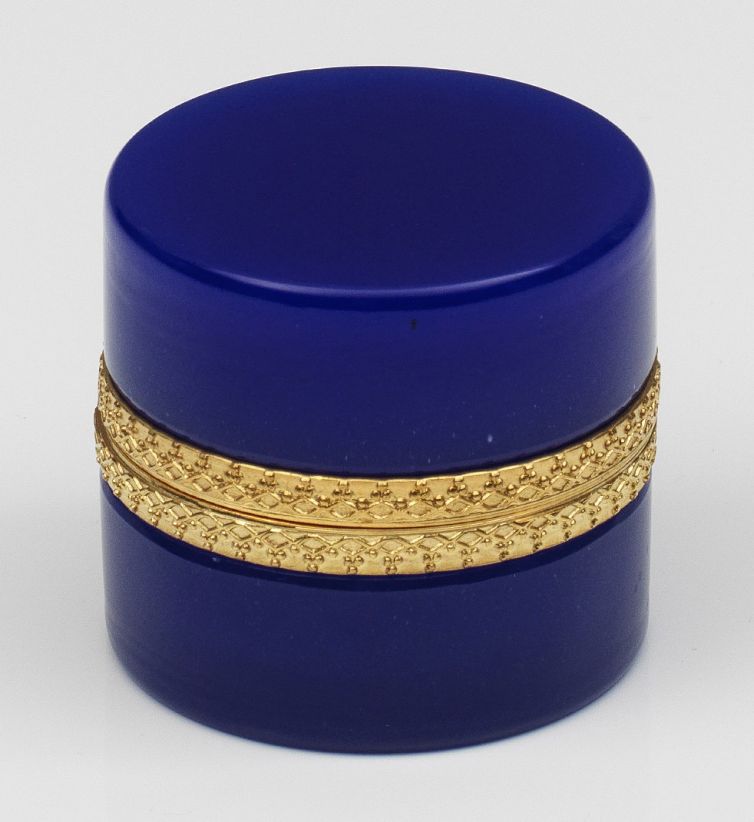 Art Déco-Dose Zylindrisch. Dunkelblaues Opalglas, geschliffen und poliert. Scharnierte Messingmontierung mit reliefierter Ornamentbordüre. H. 5,5 cm. A French Art Deco cut dark blue glass box with brass-mounted hinged cover. Frankreich. Um 1935-1940.