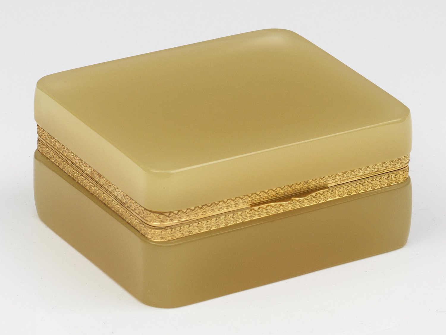 Art Déco-Dose Rechteckig mit abgerundeten Ecken. Apricotfarbenes Opalglas, geschliffen und poliert. Scharnierte Messingmontierung mit reliefierter Ornamentbordüre. H. 6 cm. 12,3 cm x 11 cm.