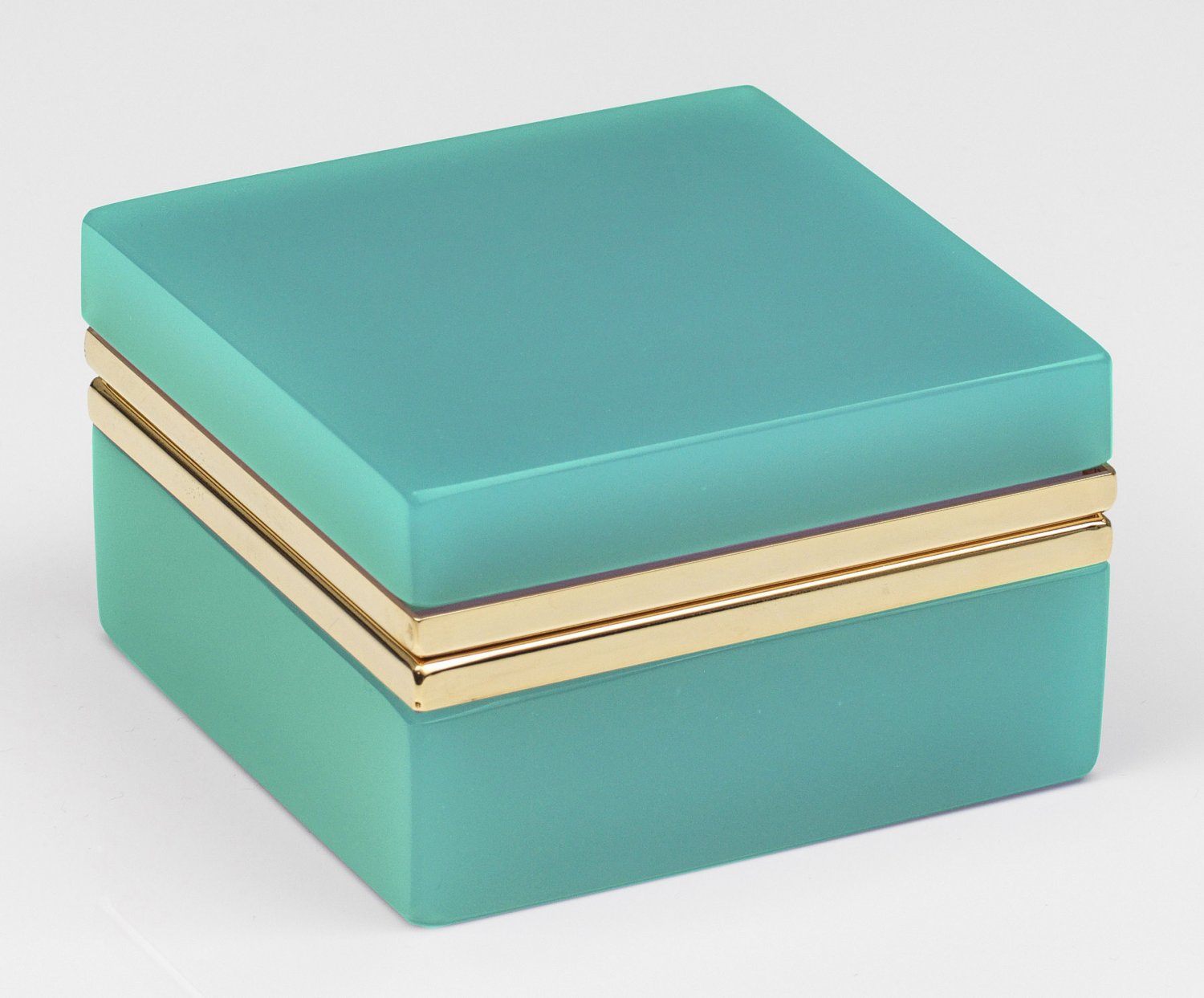 Quadratische Art Déco-Dose Mintgrünes Opalglas, geschliffen und poliert. Scharnierte Messingmontierung. H. 6,2 cm. 10,5 cm x 10,5 cm. A square-shaped French Art Deco cut and polished light turquoise glass box and brass-mounted hinged cover. Frankreich. Um 1935-1940.