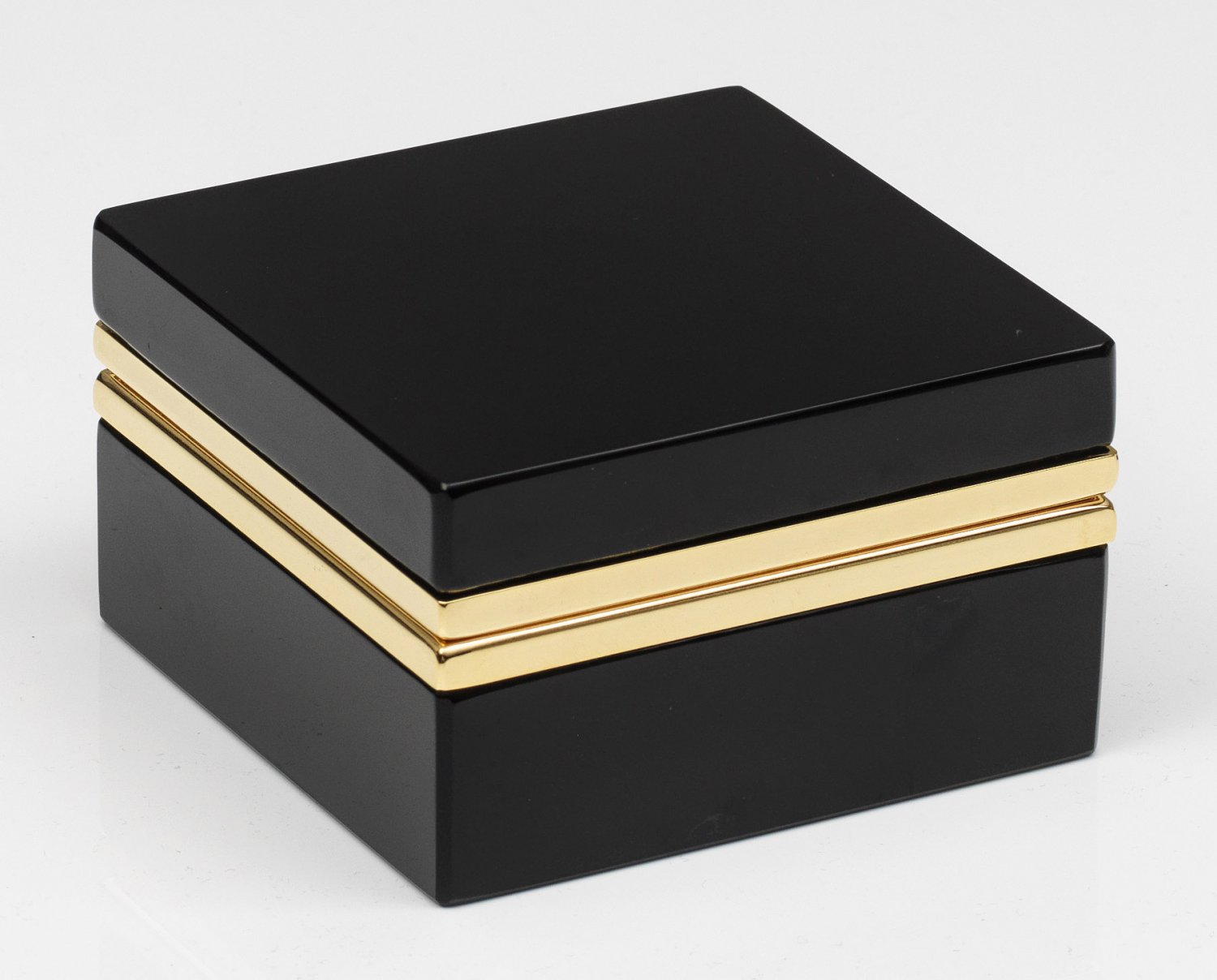 Quadratische Art Déco-Dose Schwarzes Opalglas, geschliffen und poliert. Scharnierte Messingmontierung. H. 6,2 cm. 10,5 cm x 10,5 cm. A square-shaped French Art Deco cut and polished black glass box and brass-mounted hinged cover. Frankreich. Um 1935-1940.