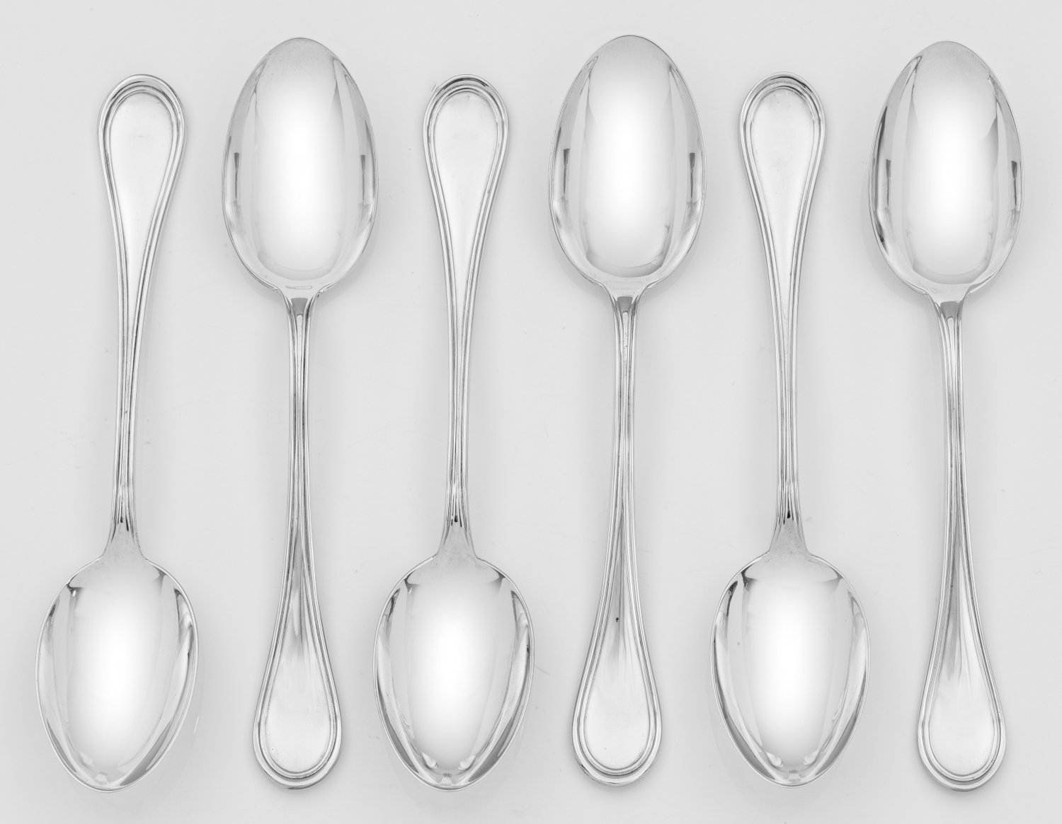 Menülöffel Silber. 6-tlg.; Ovoide Laffe, übergehend in randprofilierten Griff. Modell Schwedisch Faden. Gest. 800, Herstellerzeichen. Minim. Gebrauchsspuren. Gew. zus. ca. 415 g. L. 20 cm.