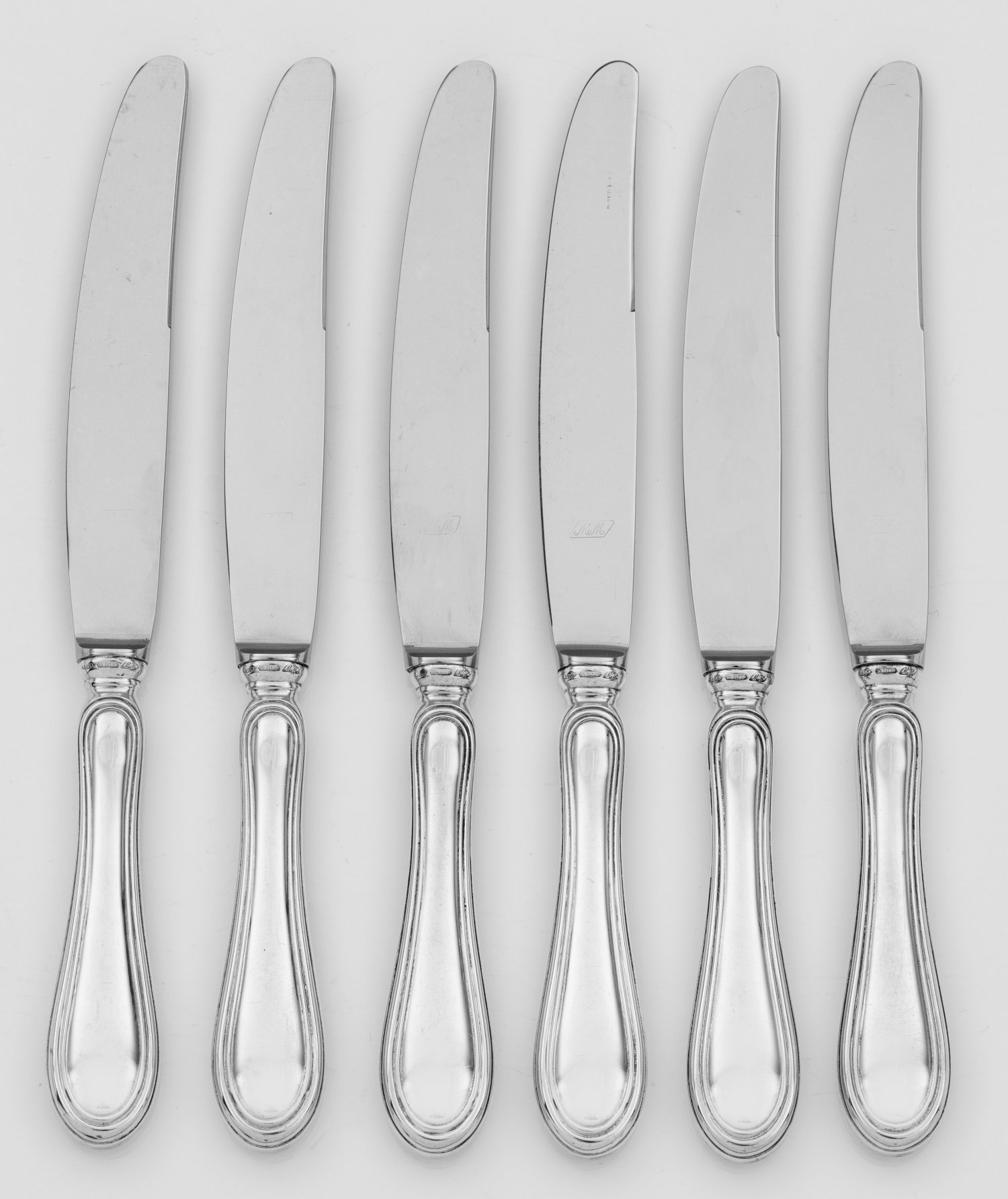 Menümesser Silber und Edelstahl. 6-tlg.; Mit randprofiliertem Griff. Modell Schwedisch Faden. Gest. 800, Herstellerzeichen. L. 25 cm. Six Italian silver and stainless steel menu forks. Standard mark 800, maker's mark. Italien. Padua. 20. Jh.