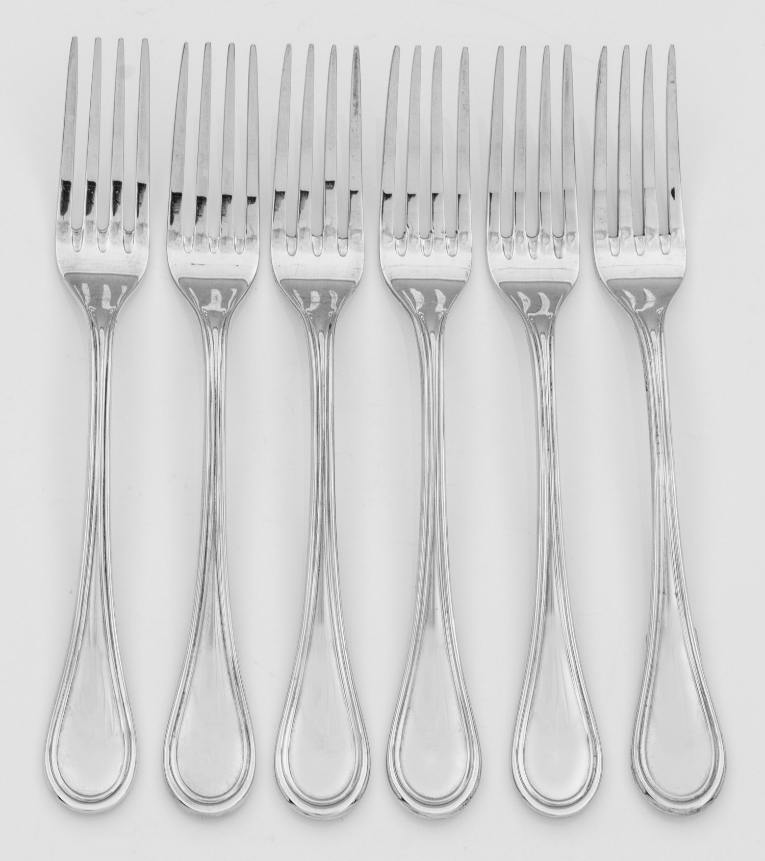 Dessertgabeln Silber. 6-tlg.; Mit randprofiliertem Griff. Modell Schwedisch Faden. Gest. 800, Herstellerzeichen. Gew. zus. ca. 255 g. L. 17 cm. Six Italian silver dessert forks. Standard mark 800, maker's mark. Italien. Padua. 20. Jh.