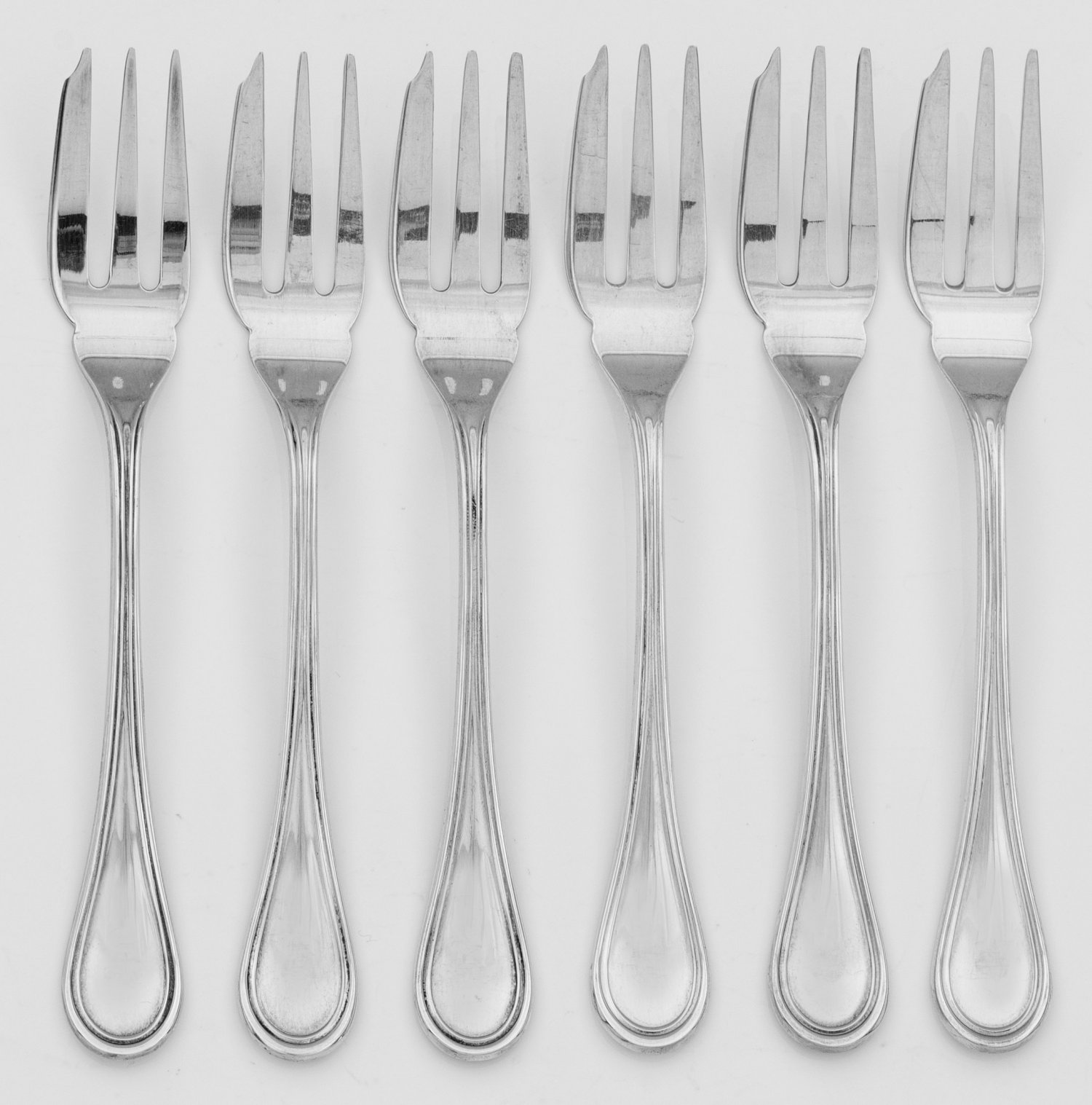 Kuchengabeln Silber. 6-tlg.; Dreizinkige Gabel mit flachem, profiliertem Griff. Modell Schwedisch Faden. Gest. 925, Herstellerzeichen. Gew. zus. ca. 120 g. L. 14,5 cm. Six Italian Sterling silver cake forks. Standard mark 925, maker´s mark. Italien. Padua. 20. Jh.