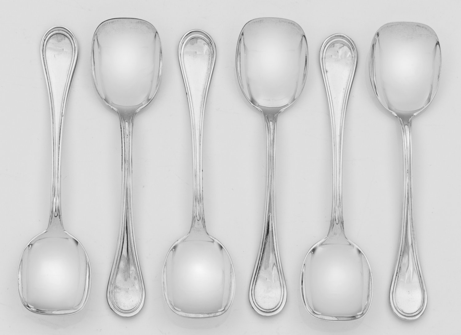 Eislöffel Silber. 6-tlg.; Ovoide, sich leicht erweiternde Laffe, übergehend in randprofilierten Griff. Modell Schwedisch Faden. Gest. 800, Herstellerzeichen. Gew. zus. ca. 115 g. L. 12,5 cm. Six Italian silver ice spoons. Standard mark 800, maker's mark. Italien. 20. Jh.