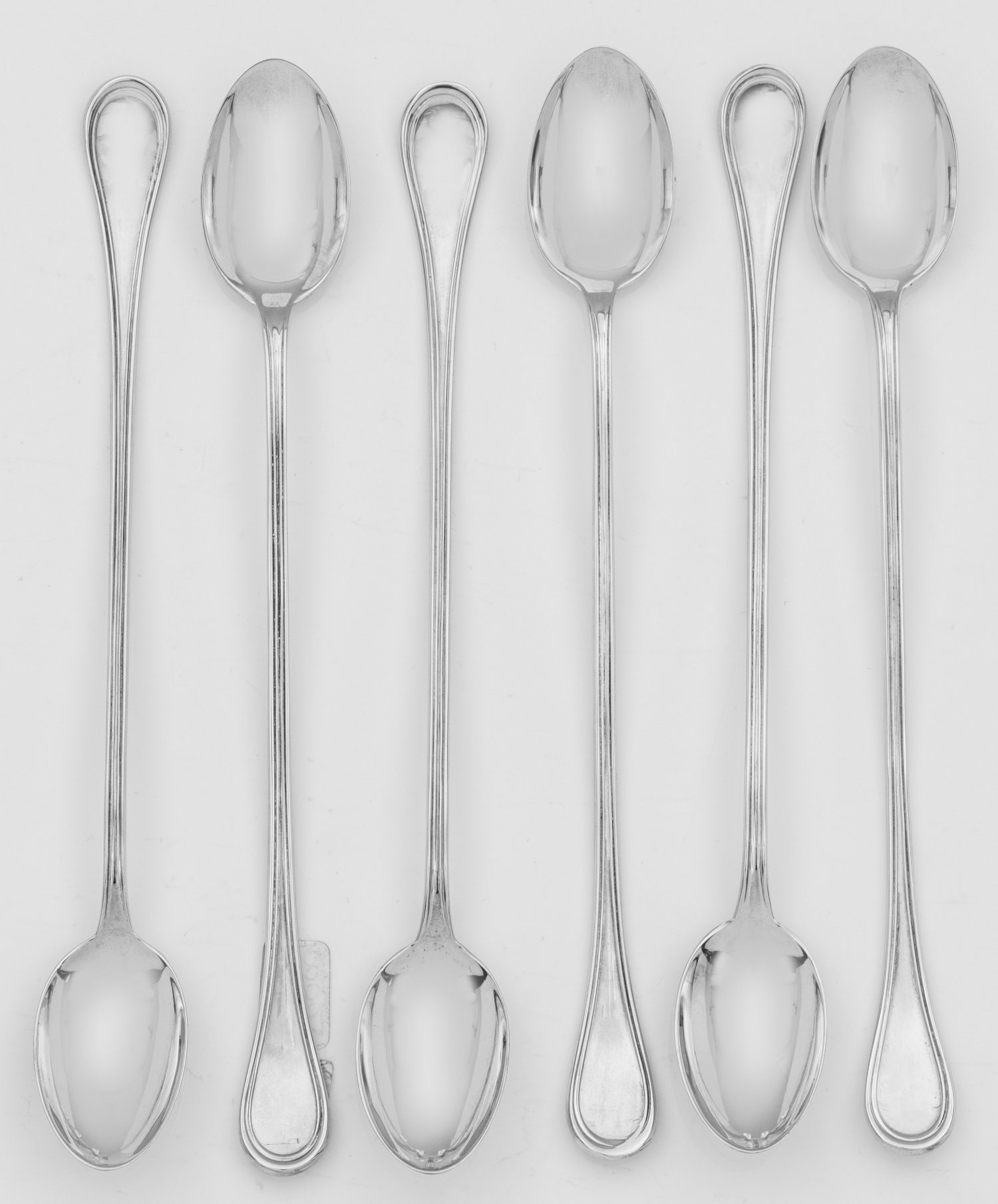 Longdrink-Löffel Silber. 6-tlg.; Ovoide Laffe, übergehend in einen langgezogenen, randprofilierten Griff. Modell Schwedisch Faden. Gest. 800. Gew. zus. ca. 170 g. L. 18,5 cm. Six Italian silver longdrink spoons. Standard mark 800. Italien. 20. Jh.