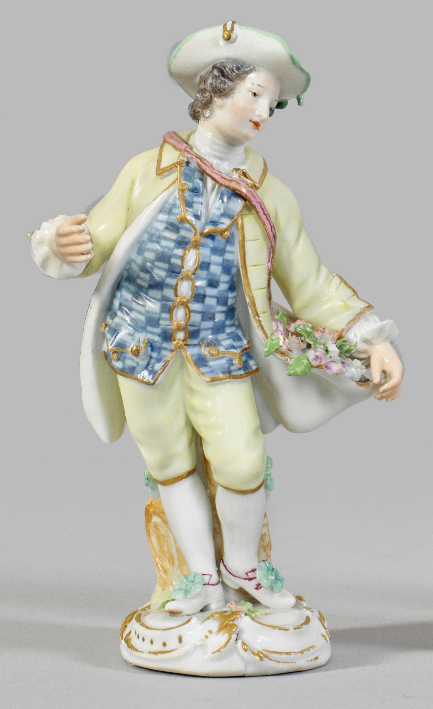 Blumenkavalier Auf rocaillereliefiertem Sockel stehender junger Herr in gelber Kniebundhose und einem mit plastisch aufgelegten Blüten geschmückten Gehrock über blau-weiß gemusterter Weste. Polychrome Malerei mit Goldkonturierung. Unw. rest.; Schwertermarke. H. 14 cm.