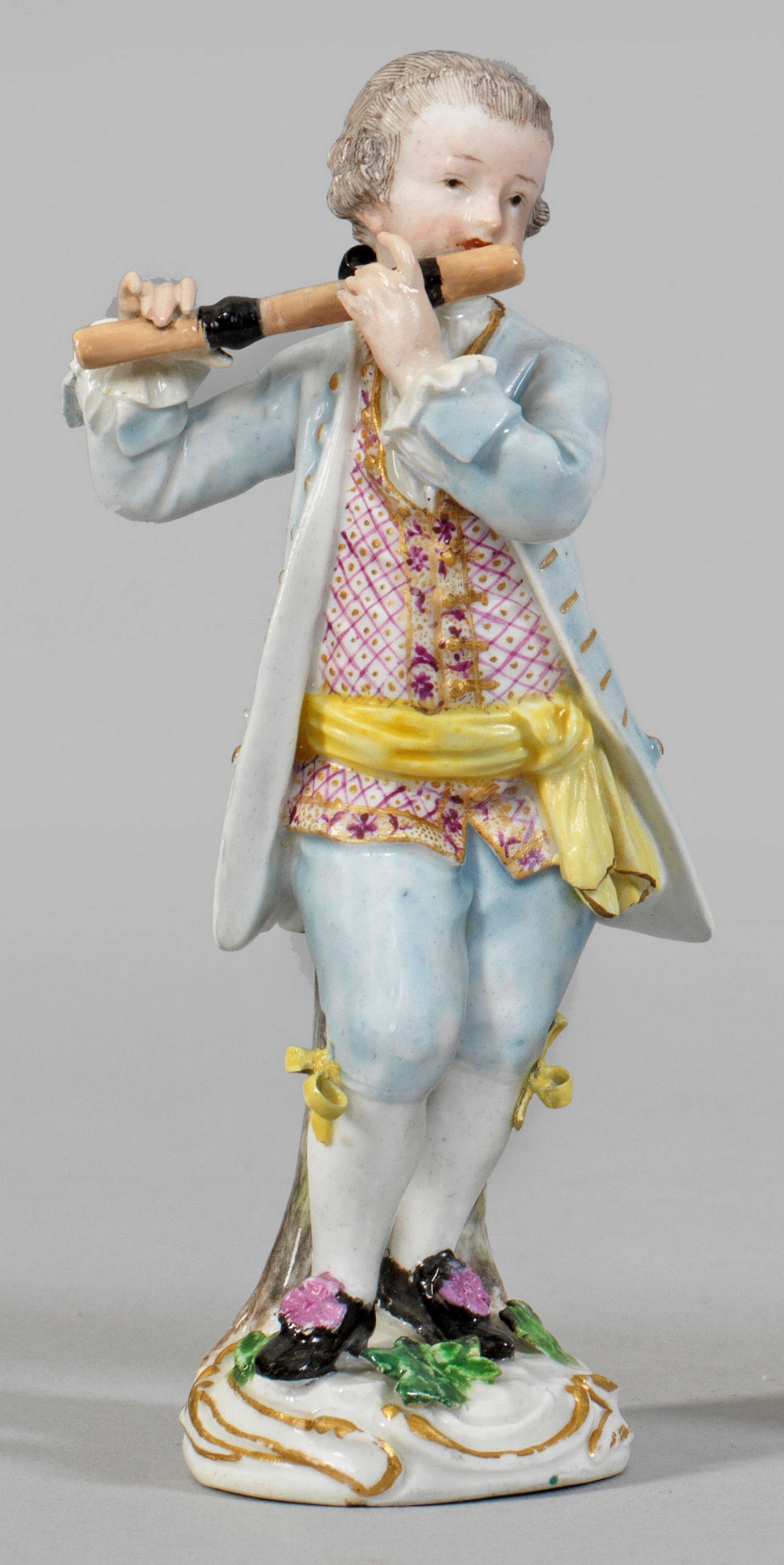 Querflötenspieler aus der Serie "Galanten Kapelle". Auf rocaillereliefiertem, mit plastischen Blättern belegtem Sockel stehender junger, die Querflöte spielender Herr. Polychrome Malerei mit Goldstaffage. Entw. Friedrich Elias Meyer. Minim. rest.; Schwertermarke. H. 13 cm.