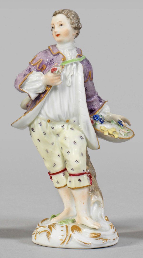 Gärtnerkind als Blumenkavalier Auf rocaillereliefiertem Sockel, an einem Baumstamm stehender Knabe mit Schultertasche in sommerlicher Kleidung, in der rechten Hand Blüten, in der Linken einen Hut haltend. Polychrome Malerei mit Goldkonturierung. Entw. Johann Joachim Kaendler. Modell-Nr. 19. Minim. best./rest.; Schwertermarke. H. 13,5 cm.