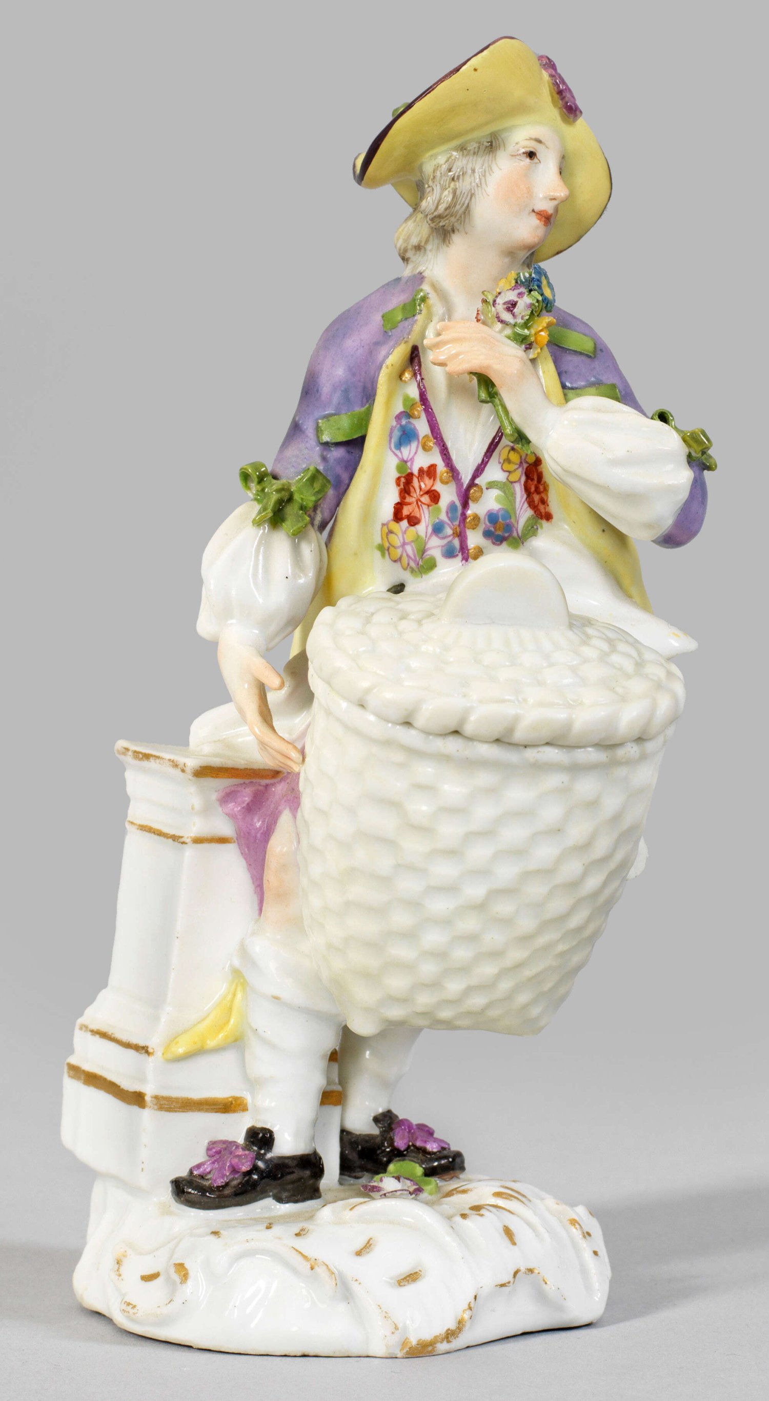 Seltene Figur eines Herrn mit Deckelkorb Auf rocaillereliefiertem Sockel, gelehnt an einen profilierten Podestsockel, stehender Herr in purpurfarbener Hose mit blütengemusterter Weste und lavendelblauem Wams. Das dunkle Haar von einem gelben Hut bedeckt. Vor sich einen großen Weidenkorb tragend. Polychrome Malerei mit Goldkonturierung. Entw. wohl Johann Joachim Kaendler und Peter Reinicke. Im Boden Nr. 671. in Rot. Minim. rest.; Schwertermarke. H. 14 cm.