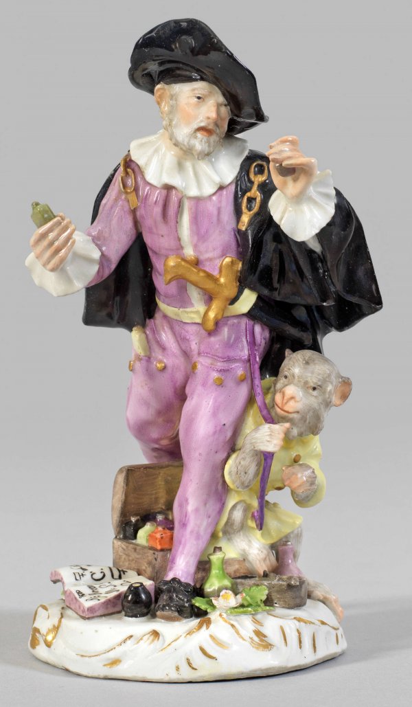 Auf einem rocaillereliefiertem, mit plastischen Blüten belegten Sockel in schreitender Haltung dargestellter Herr in purpurfarbener Kleidung, schwarzem Umhang sowie Hut, in seiner linken Hand ein Medizinfläschchen haltend. Seitlich gegürtetes Schwert. Zu seinen Füßen ein zwischen Kästchen, geöffnetem Buch und Utensilien hockender Affe. Entw. Johann Joachim Kaendler und Peter Reinicke. Minim. rest.; Schwertermarke. H. 15,5 cm.